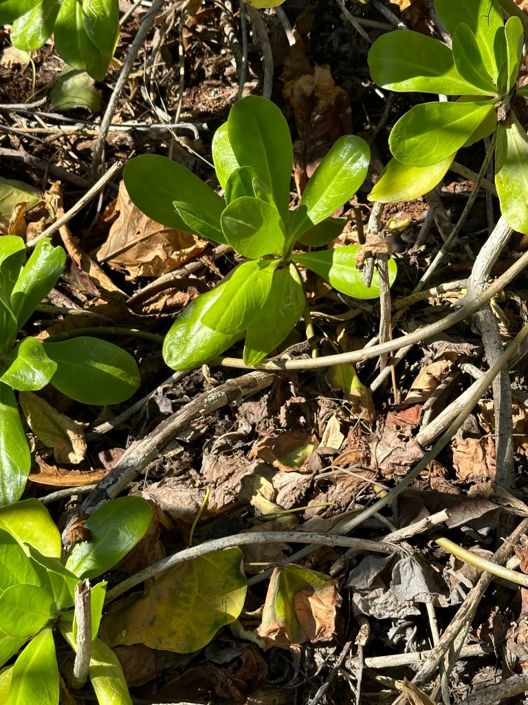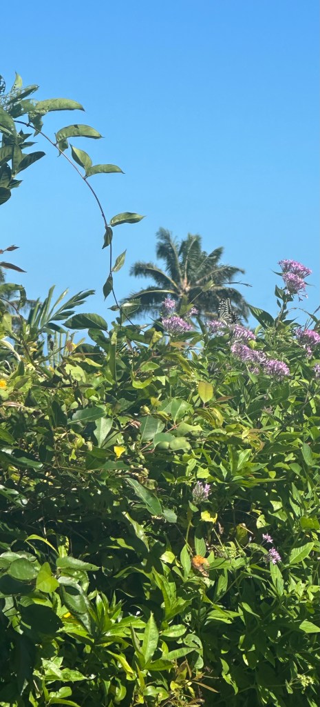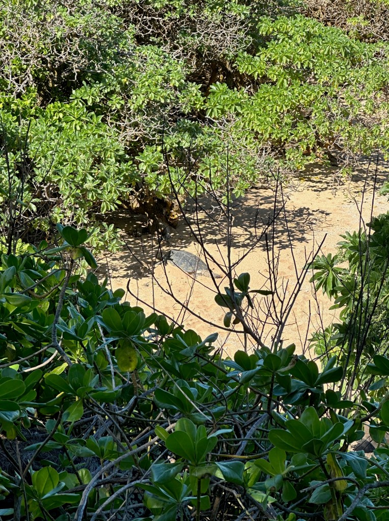 There are so many beautiful hikes in Kauai. As you explore the lush landscapes, navigating sometimes steep, muddy trails, dodging tree roots, ducking your head under hanging tree limbs, hopping over rocks to forge streams, listening to exotic birds, mesmerized by the tropical scenery, you might miss something. As you gaze at a tree branch, there might be a wonderful little creature staring right at you that you don’t even see. For example, dear reader, we are now on a hike overlooking Larsen’s beach. Do you see anything in the sand below?