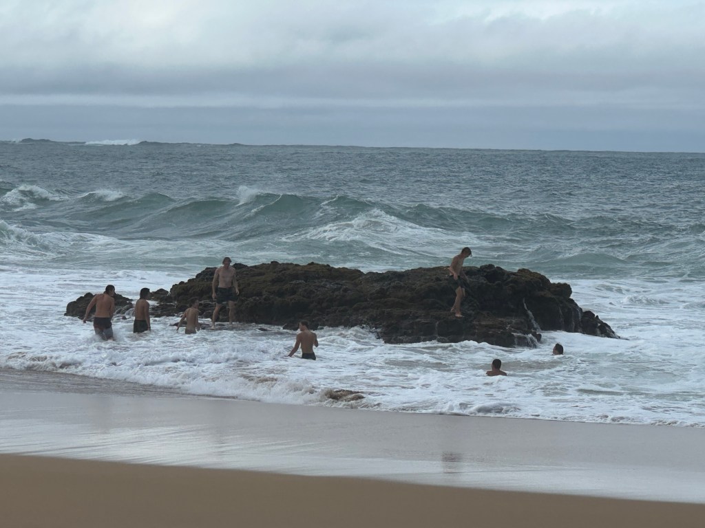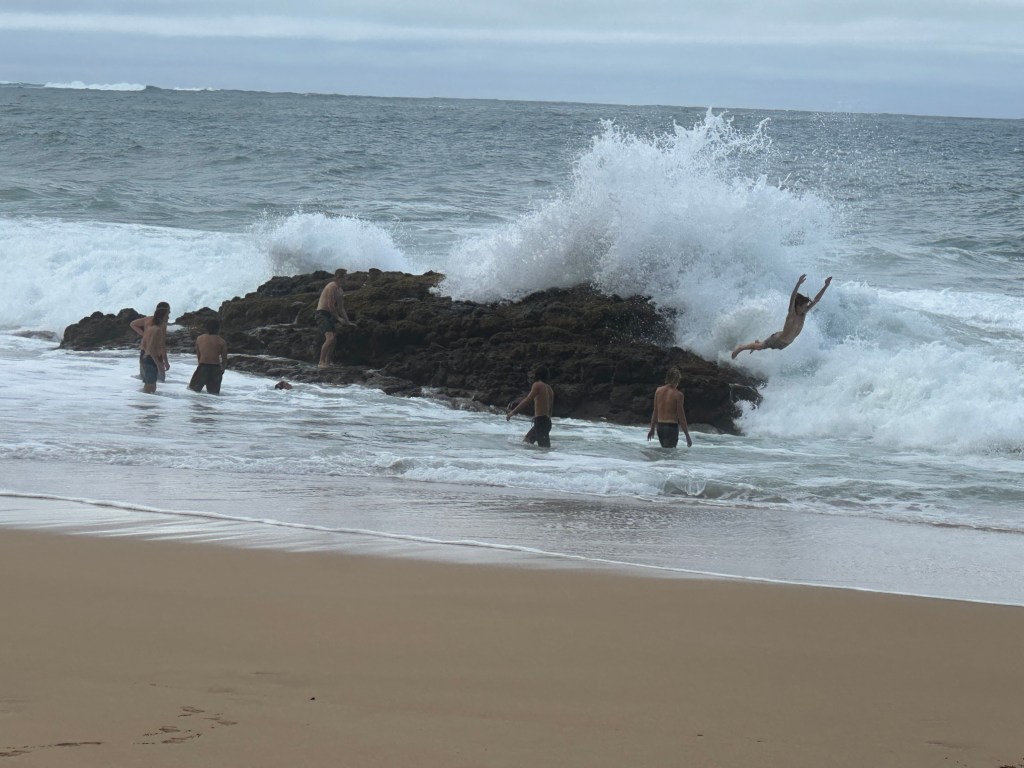 A few miles further north from Hanalei Bay is Lumaha’i Beach, especially thrilling in a high surf. Climb on this rock to play chicken with the roiling surf. Or as a 70-yr-old, do it vicariously through these strapping teenagers (hey, it’s a weekday, aren’t you supposed to be in school? I doubt this is some kind of planned field trip. Do your parents know where you are?)