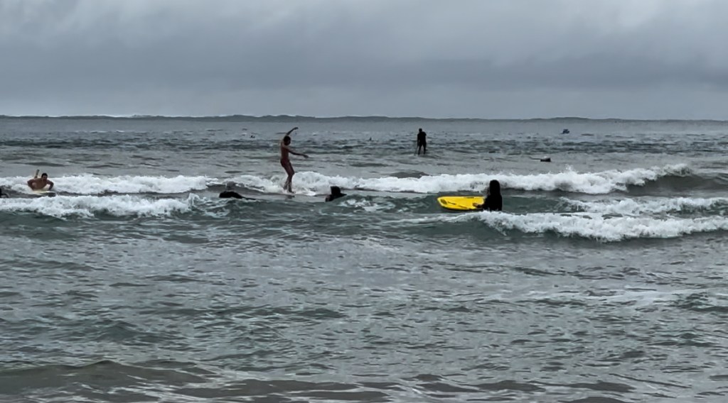 Swim or surf the waves. Or, in my case, swim or surf vicariously through other more enthusiastic water lovers, while you walk the beach. Here, I’ll take you along… you’re wearing your bathing suit, right? Let’s head into the crashing surf!