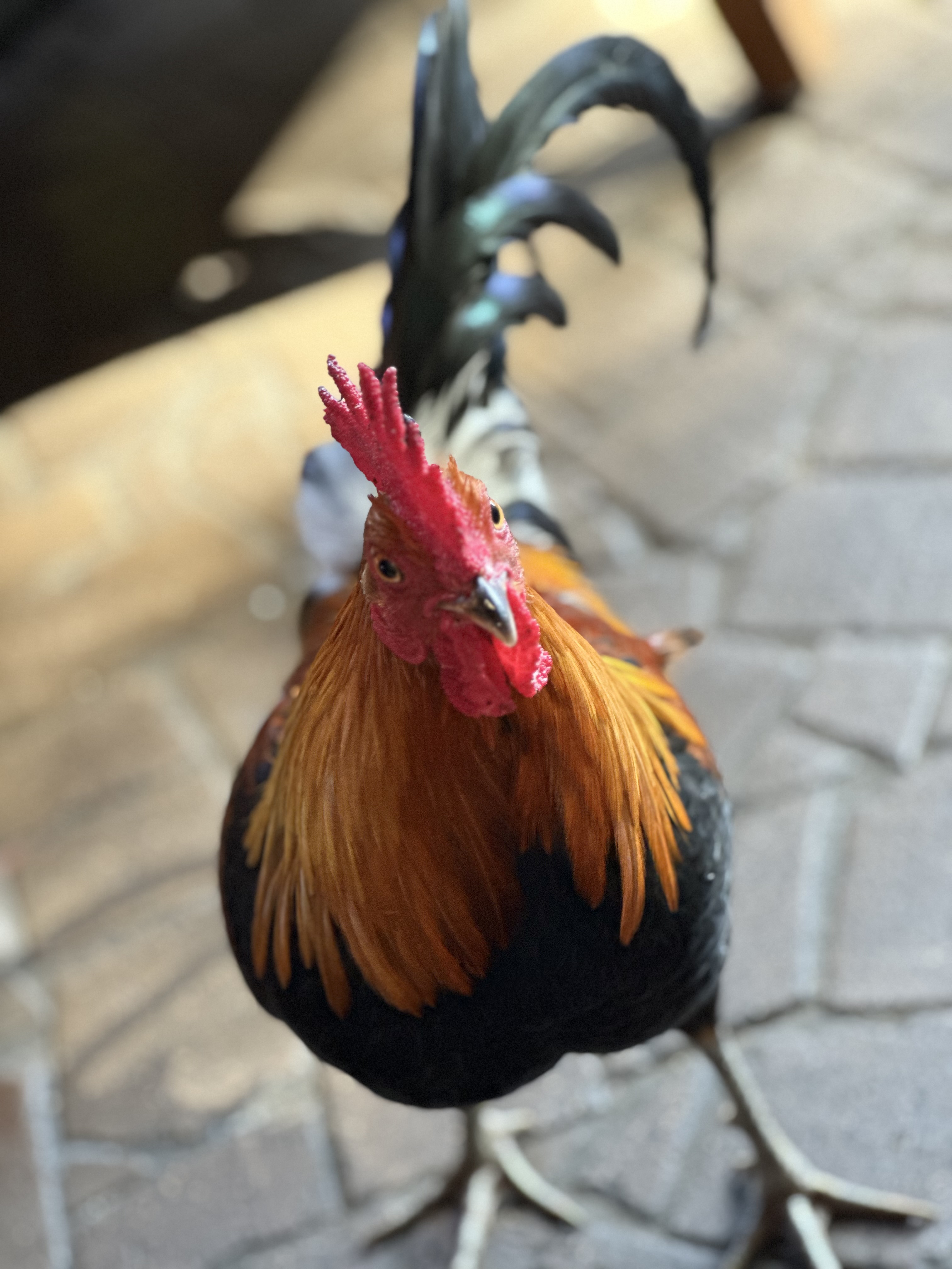 stalking us during lunch on an outdoor patio. A “Please do not feed the birds” sign is posted nearby, but how can we resist that face? Yeah, well, if you don’t resist, the rooster persists. Feral? You bet! Just try to catch that rascal.