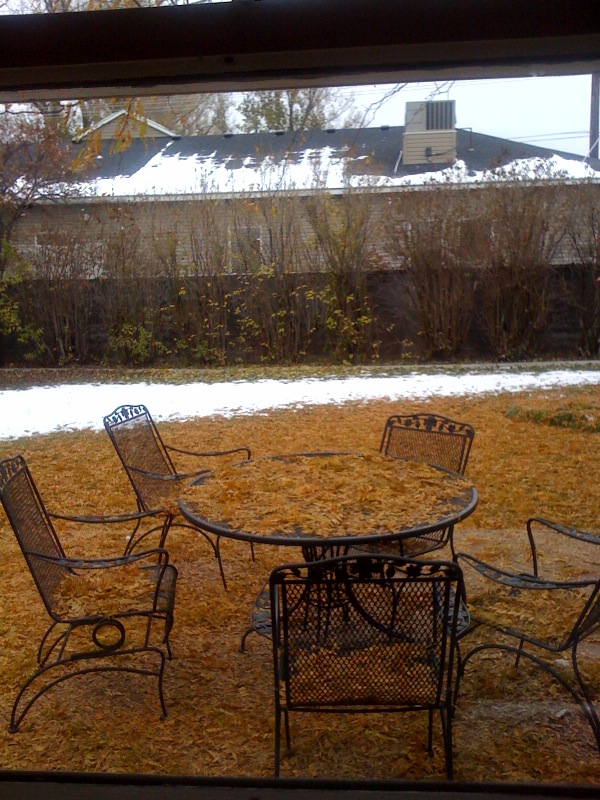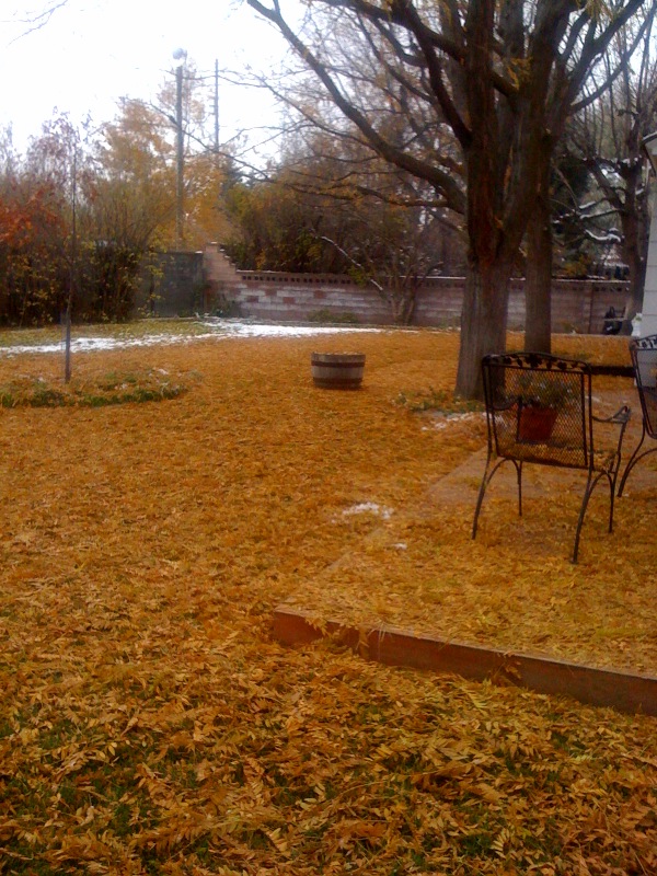 Yeah, well, it’s the weekend again now – a week after those last balmy walks through Tautphaus. The trees in our yard are stark naked, the flowers all froze. Here’s a picture of our back yard.