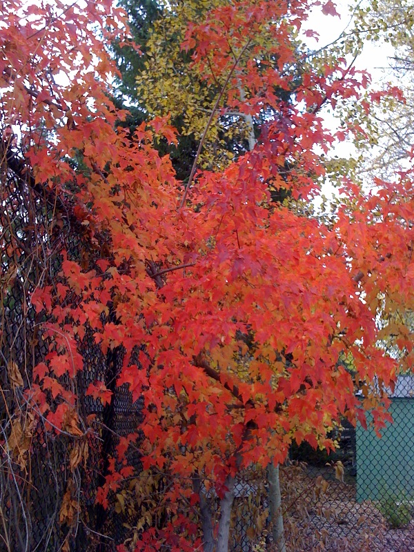 It’s knarly looking, with half its leaves gone. There’s our vibrant Canadian Maple standing in contrast in the front yard.