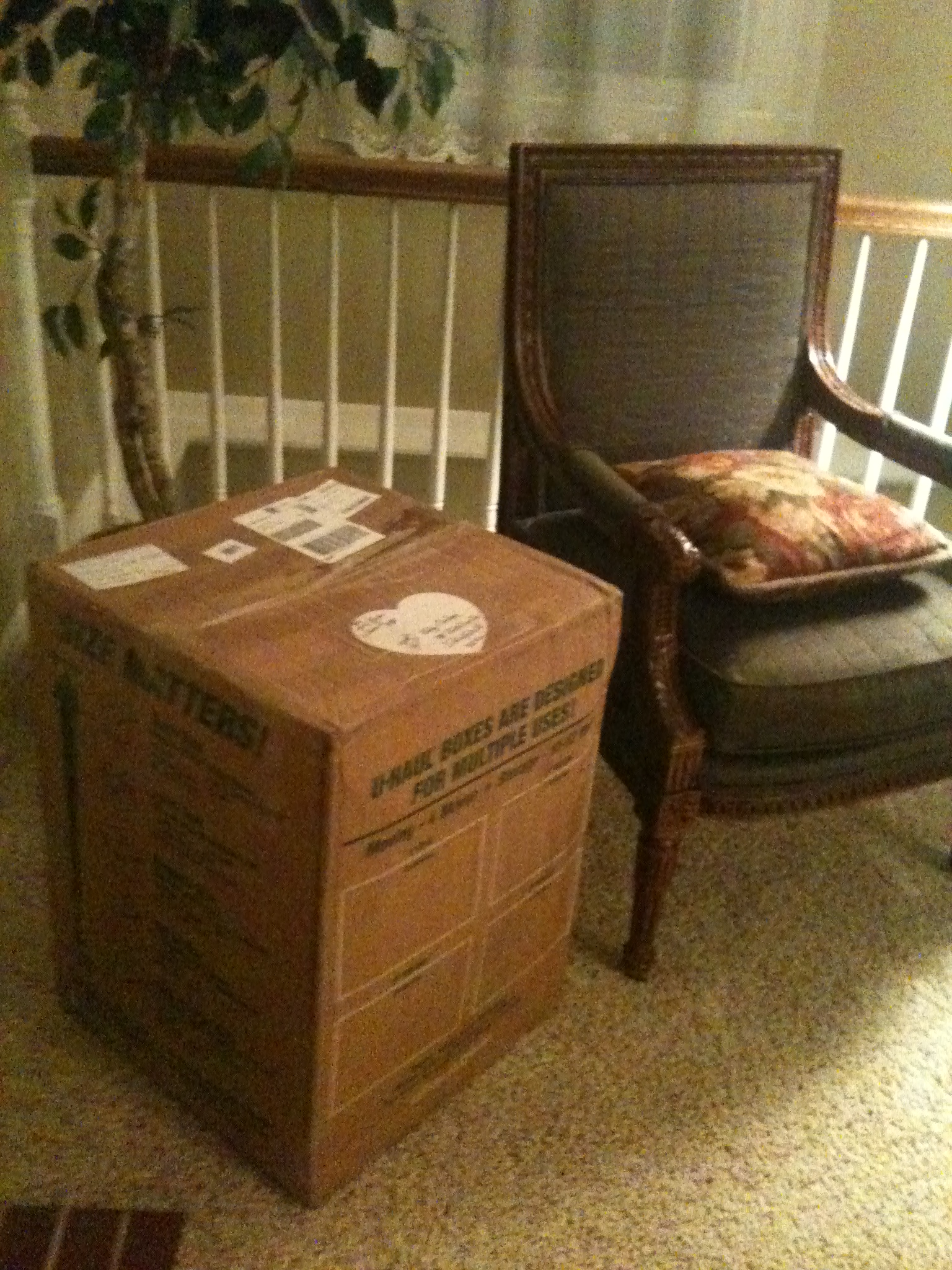 The box arrived a couple of days ago. I’ve wrestled the monstrous thing into a corner of our living room. Can’t quite muster up the energy to deal with it. I gotta open it, unpack the dishes, you know, might want to see if all 37 pieces arrived intact and figure out how I’m going to shove them all in with the rest of the set in that corner cabinet.