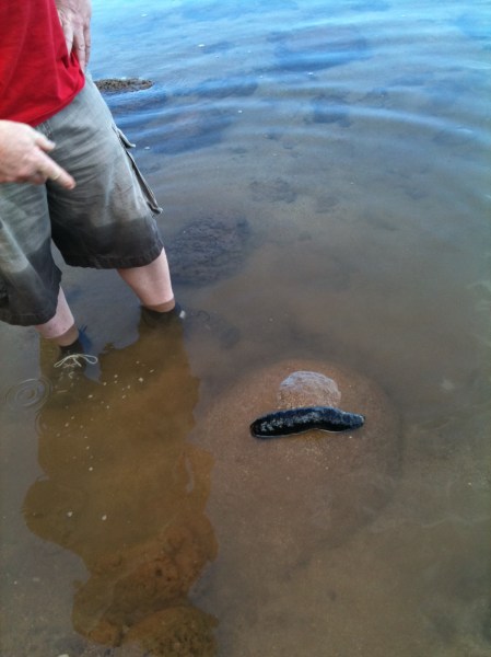 Oh, never mind. It’s a sea cucumber. The motion you see in this picture is about as much motion as you get from these delicate sea creatures (delicacy in China, anyway). Except when you pull them out of the water they squirt sea water at you out of their mouths, or is it their butts(?), since both ends look identical to the untrained eye.