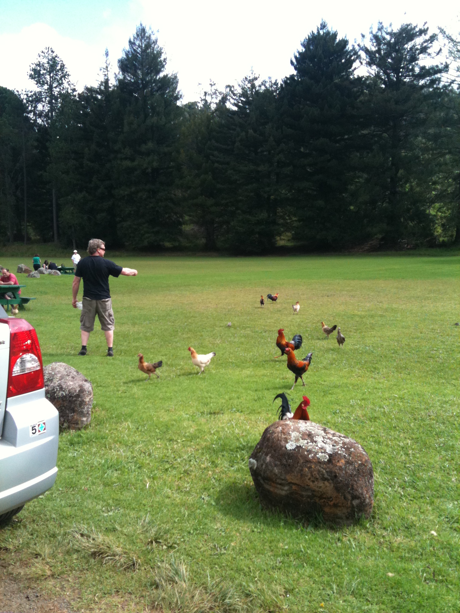 Uh, have I told you about the chickens? That they are ubiquitous in Kauai? Apparently got all swept away after Hurricane Iniki in 1992, – so they just run around and procreate in the wild. You are apt to hear a “Ur-a-ur-a-Urrr!” from about anywhere. And see them strutting and clucking out from everywhere.