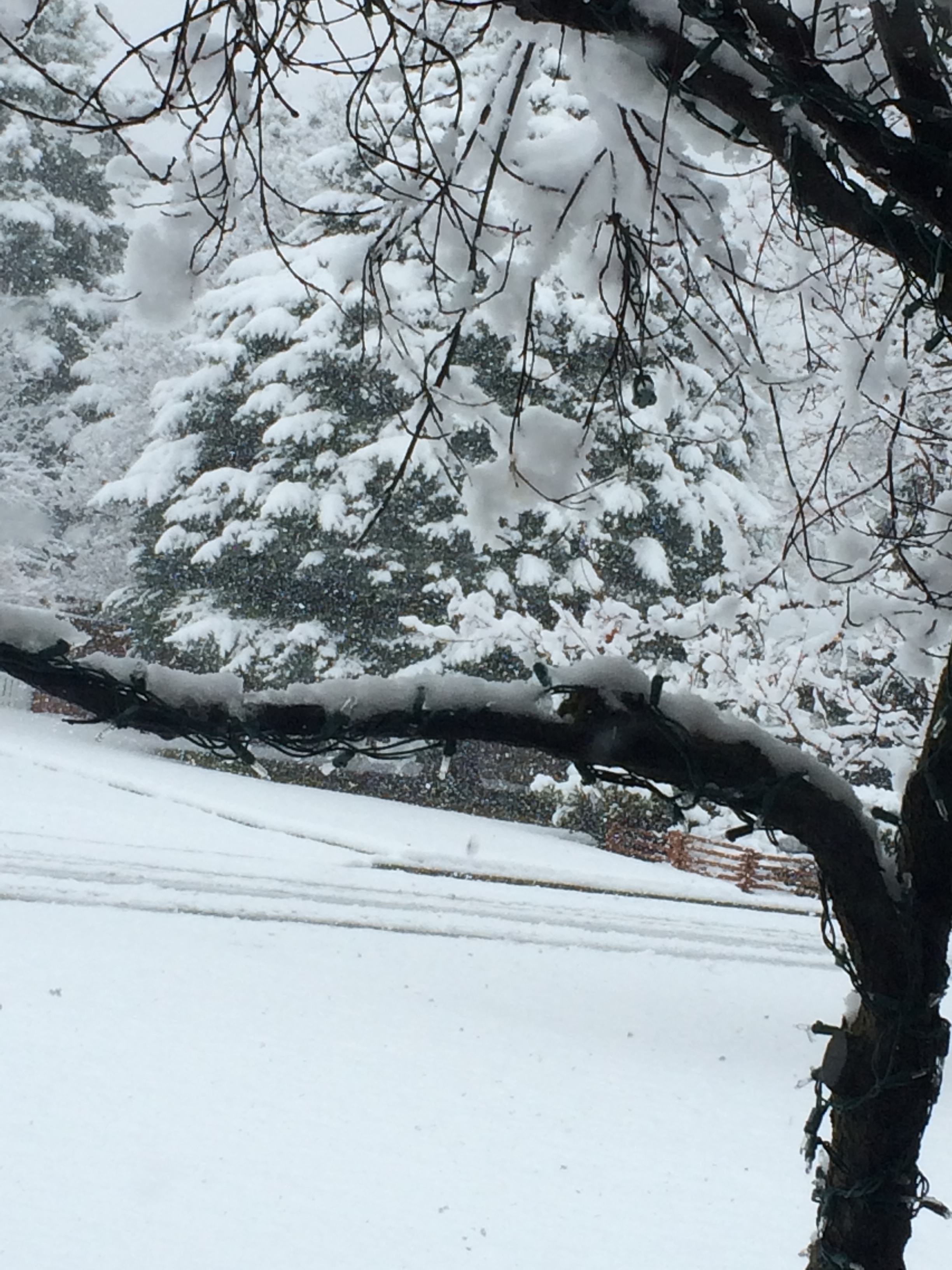 It’s Christmas!! ( No? ) It’s amusing (no it’s slothful). Our Christmas lights are still on the plum tree. I should just turn them back on! The clumps of snow accumulating on the web of tiny plum branches block out the solidness of the pine tree in the background. So the pine tree looks like a wreath perched in the middle of the plum tree. A wreath pleading for bulbous shiny ornaments and a red bow.