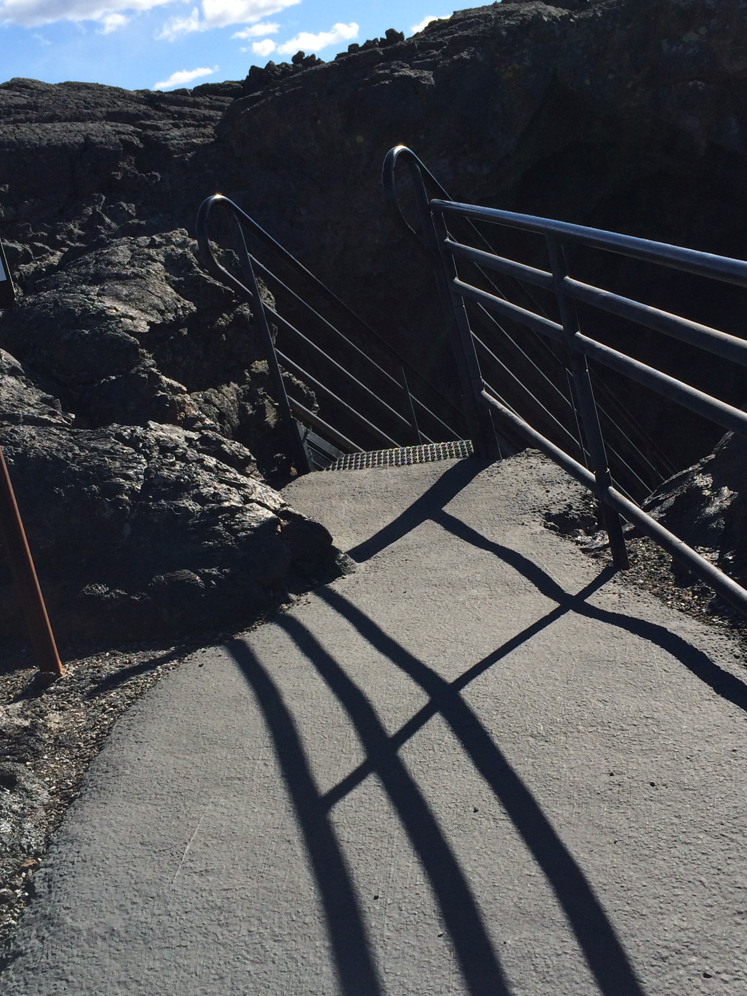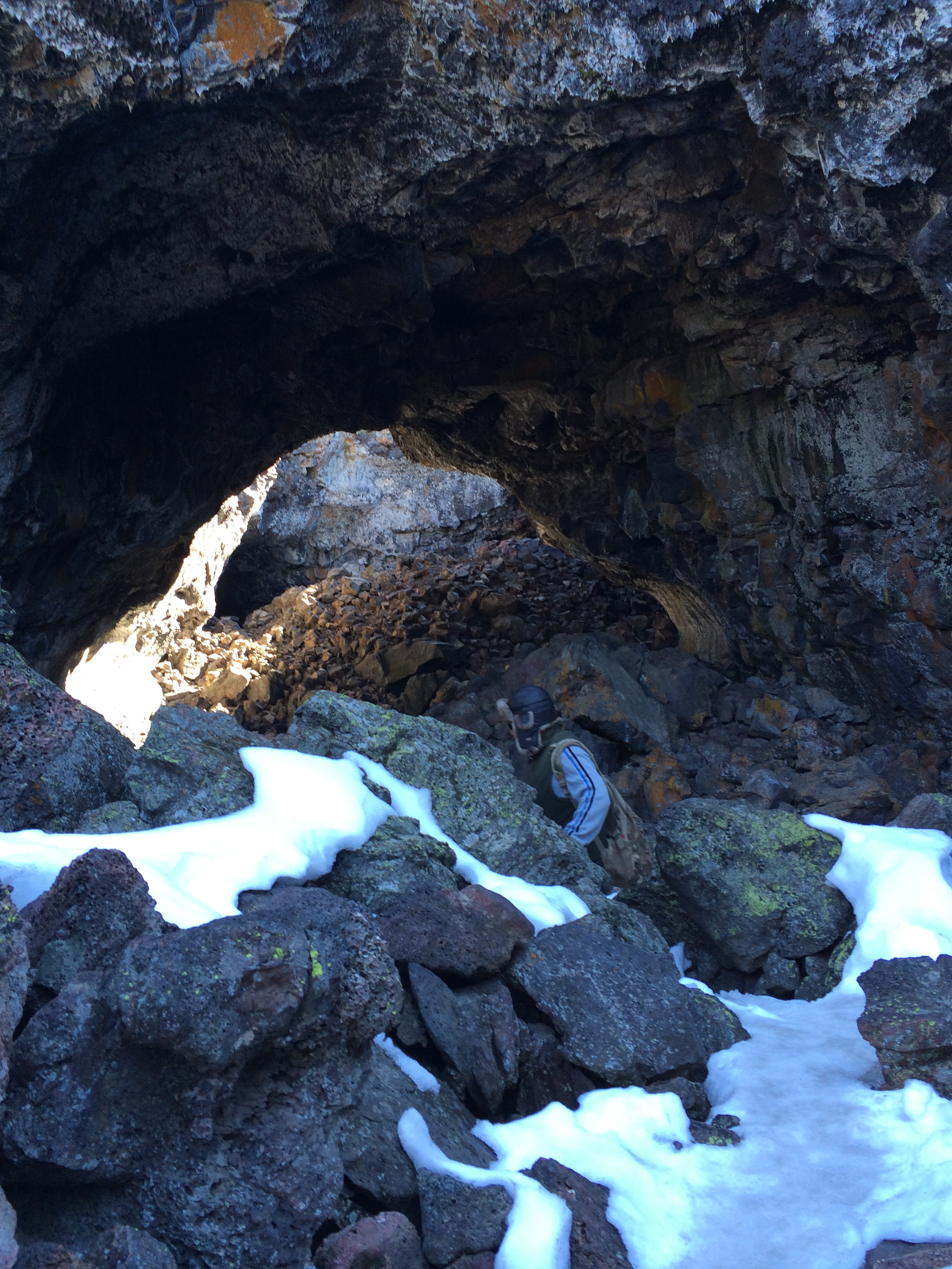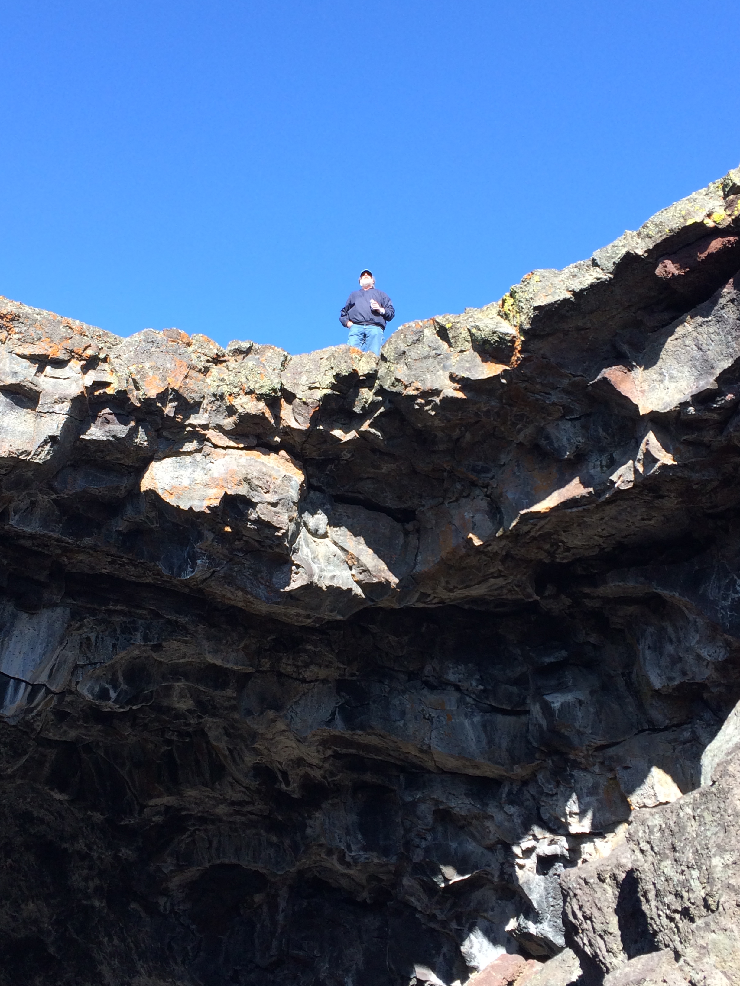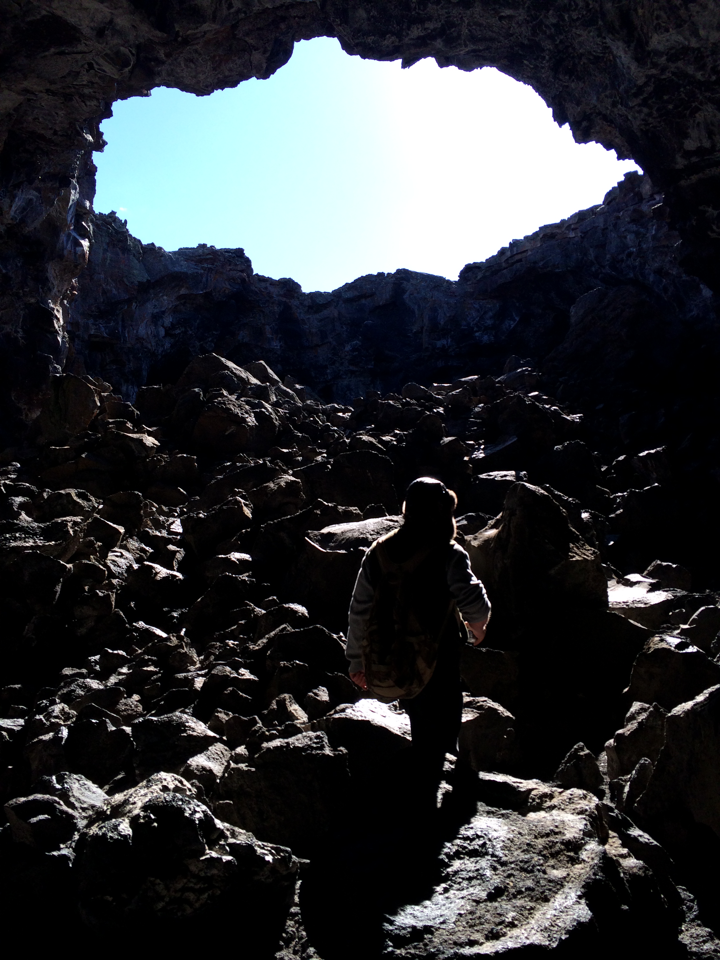 We’re at the entrance to Indian tunnel now. It is actually a lava tube, which, the way I understand it is, the lava cooled on the top while it kept flowing out underneath, leaving a hollow space. “Let’s do it!” exclaims Eric. David decides not to – he is wearing sandals. But he will meet us at the other end.