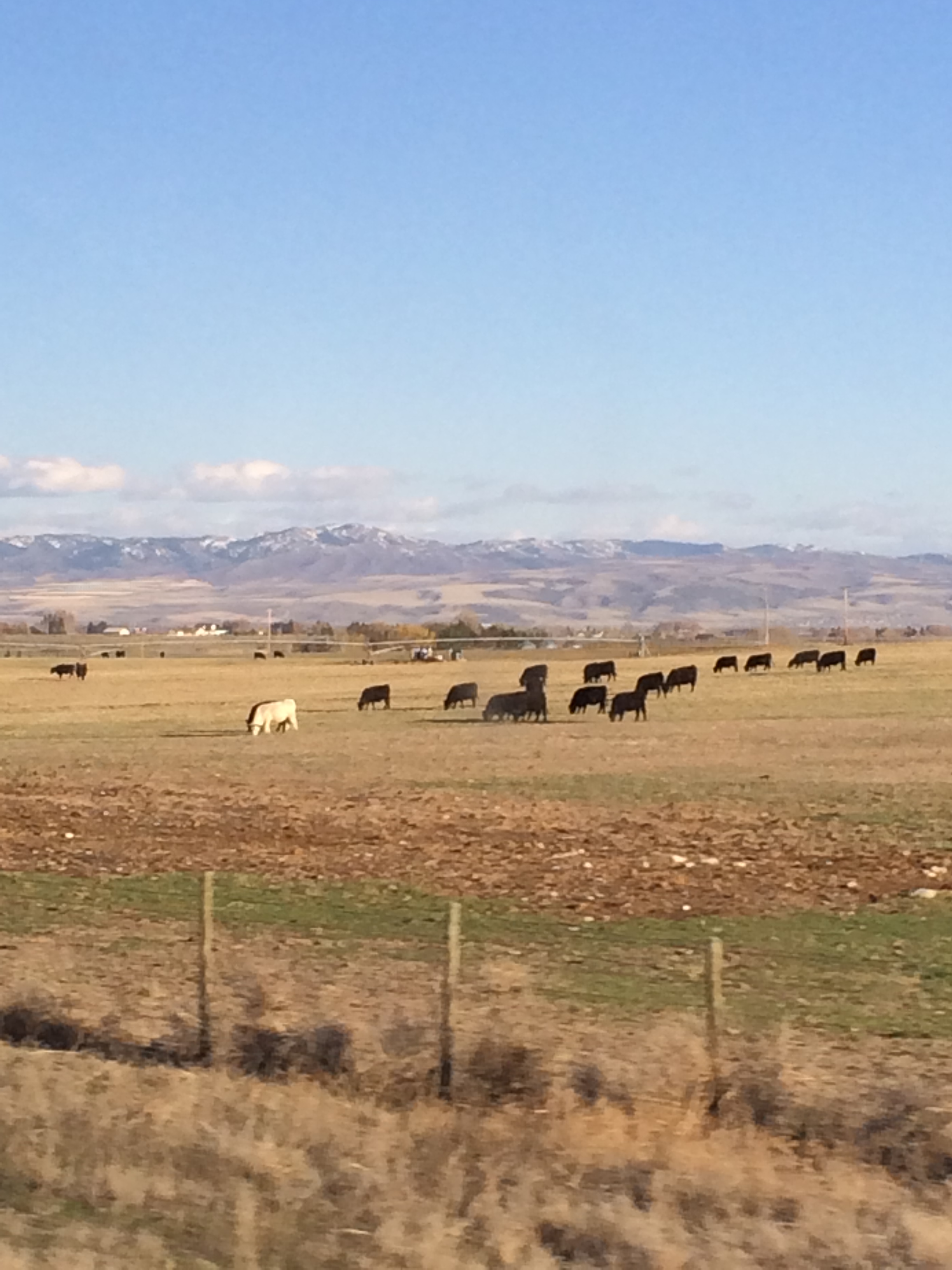 We’re just outside Idaho Falls now; Taylor Mountain has come into view. I’m sitting in the back seat, looking at Taylor Mountain in the distance – and see this herd of free-range cattle ahead. I snap a photo as we’re sailing by: