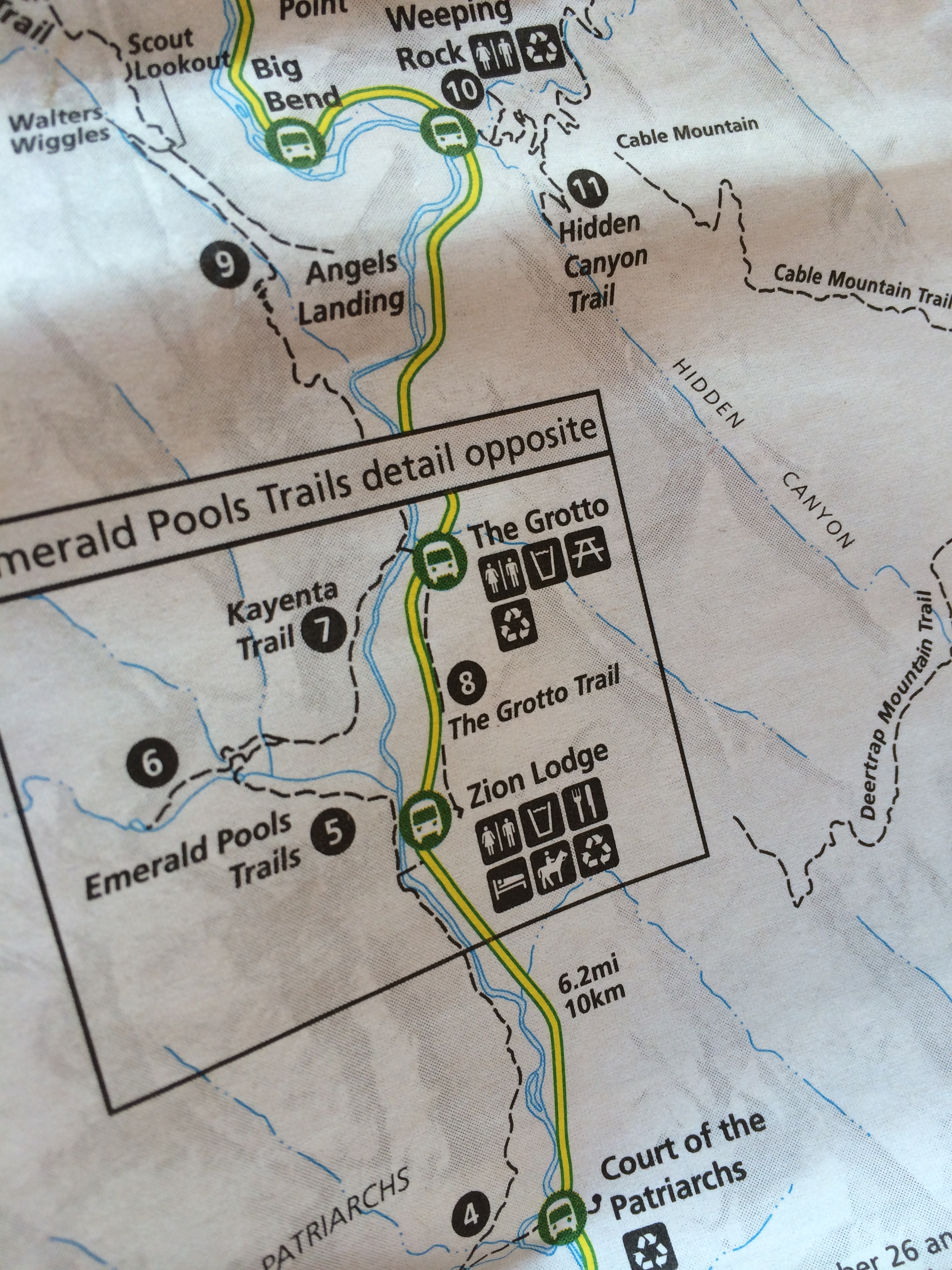 Visitors used to travel by car to the points of interest along the Zion Canyon Scenic Drive. But because of the crush of traffic, in the year 2000 a shuttle service was implemented. Now you park near the Visitor’s Center and catch one of the many shuttles that give you a guided tour with several stops. You can pick and choose where and when you want to get off the shuttle, and which trails you want explore. (Leave your pets at home if you want to ride the shuttles, by the way.) Here’s a photo of the map with the shuttle routes: