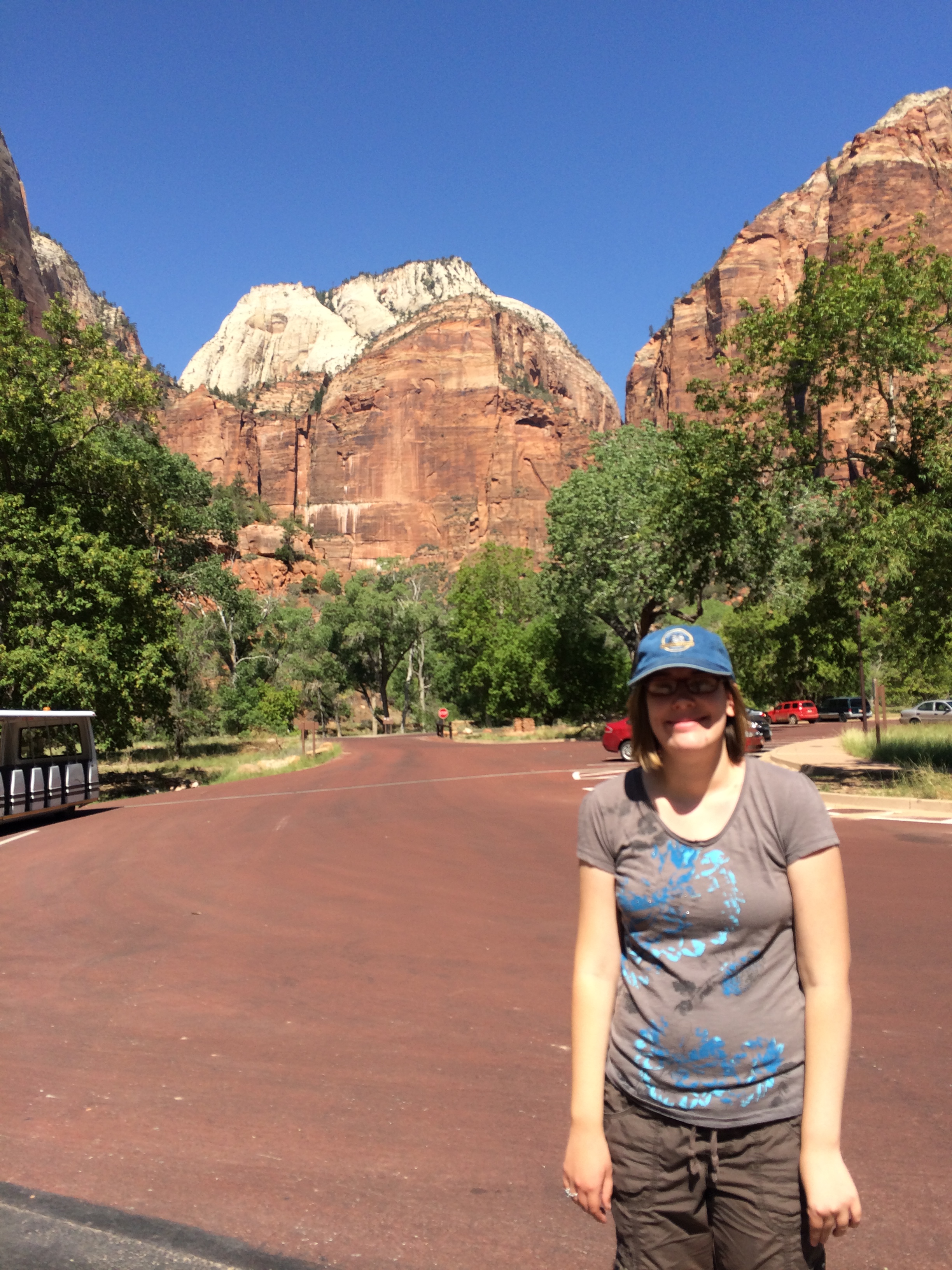 The destination was the Emerald pools – David got off at the Grotto stop and hiked the upper Kayenta trail, while Megan and I got off at the Zion Lodge, took a bathroom break, sat and shared a big fat chocolate muffin, and a beverage, took a photo….