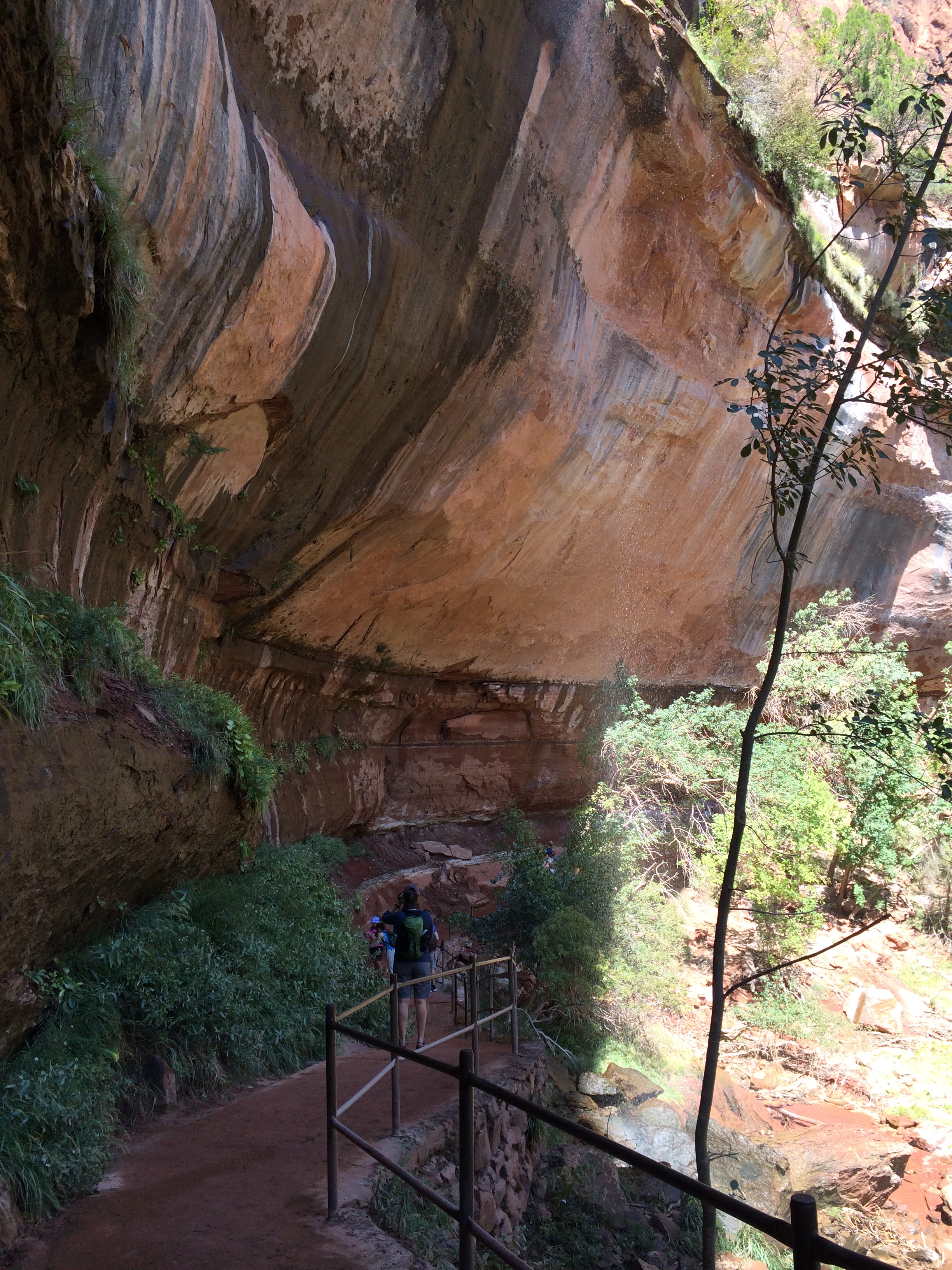 We decided to ride the shuttle to the last stop – the Temple of Sinawava – and work our way back – Here we are on the hike. It’s about impossible to capture the magnificent rock cliffs with an I-phone camera, but I give it a whirl: