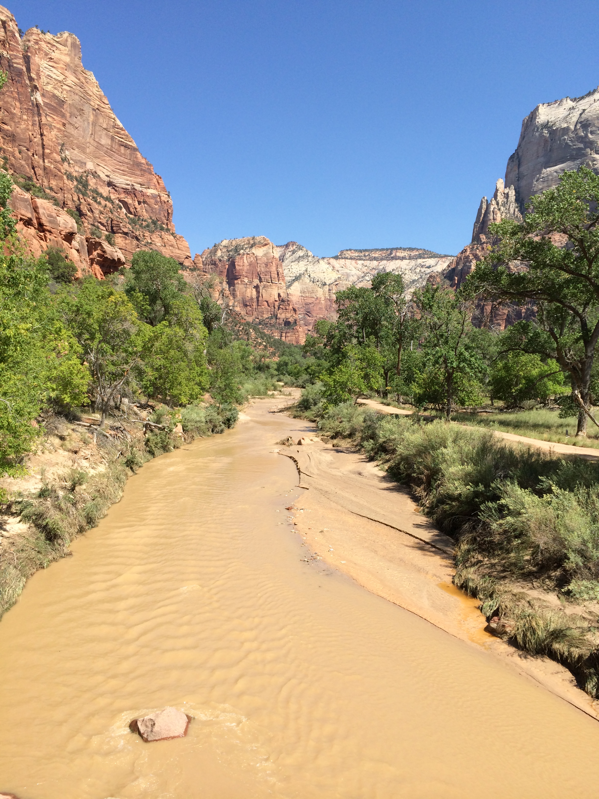 The Virgin River is still flowing fast and muddy today, two days after the biggest rain they’d had in this area in 30 years, associated with tropical storm Norbet. (check out this link). The park was closed this past Tuesday due to flooding and debis on the roads.