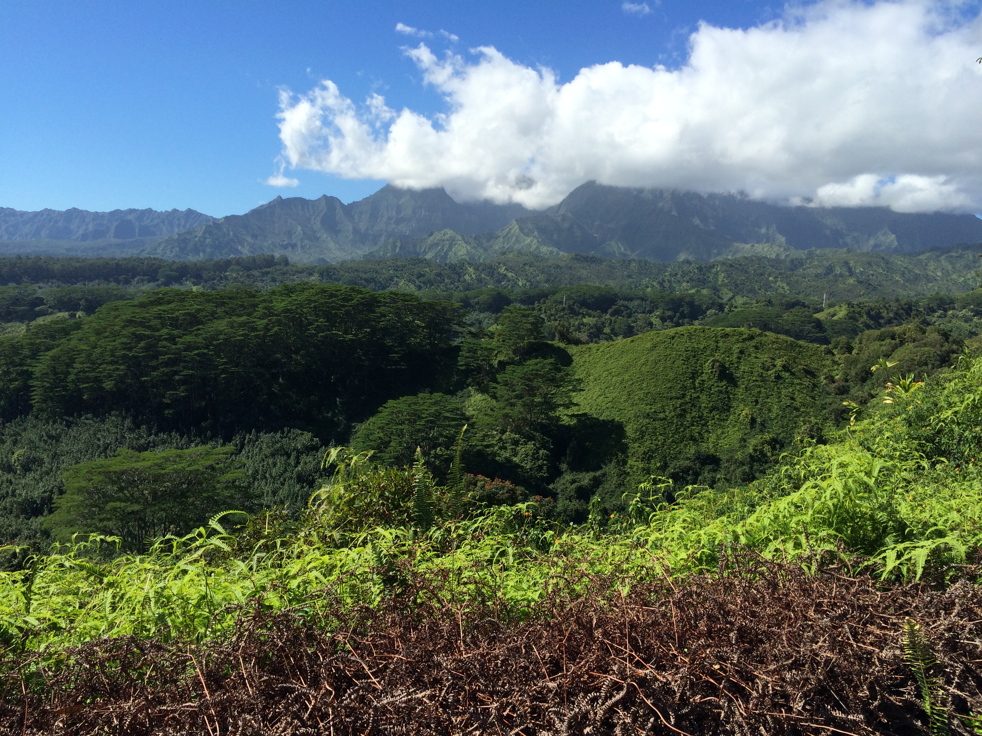 The complete Kuilau Ridge hike consists of two trails that start at opposite trailheads and meet to form a 5-mile arc: The Kuilau trail and the Moalepe trail.