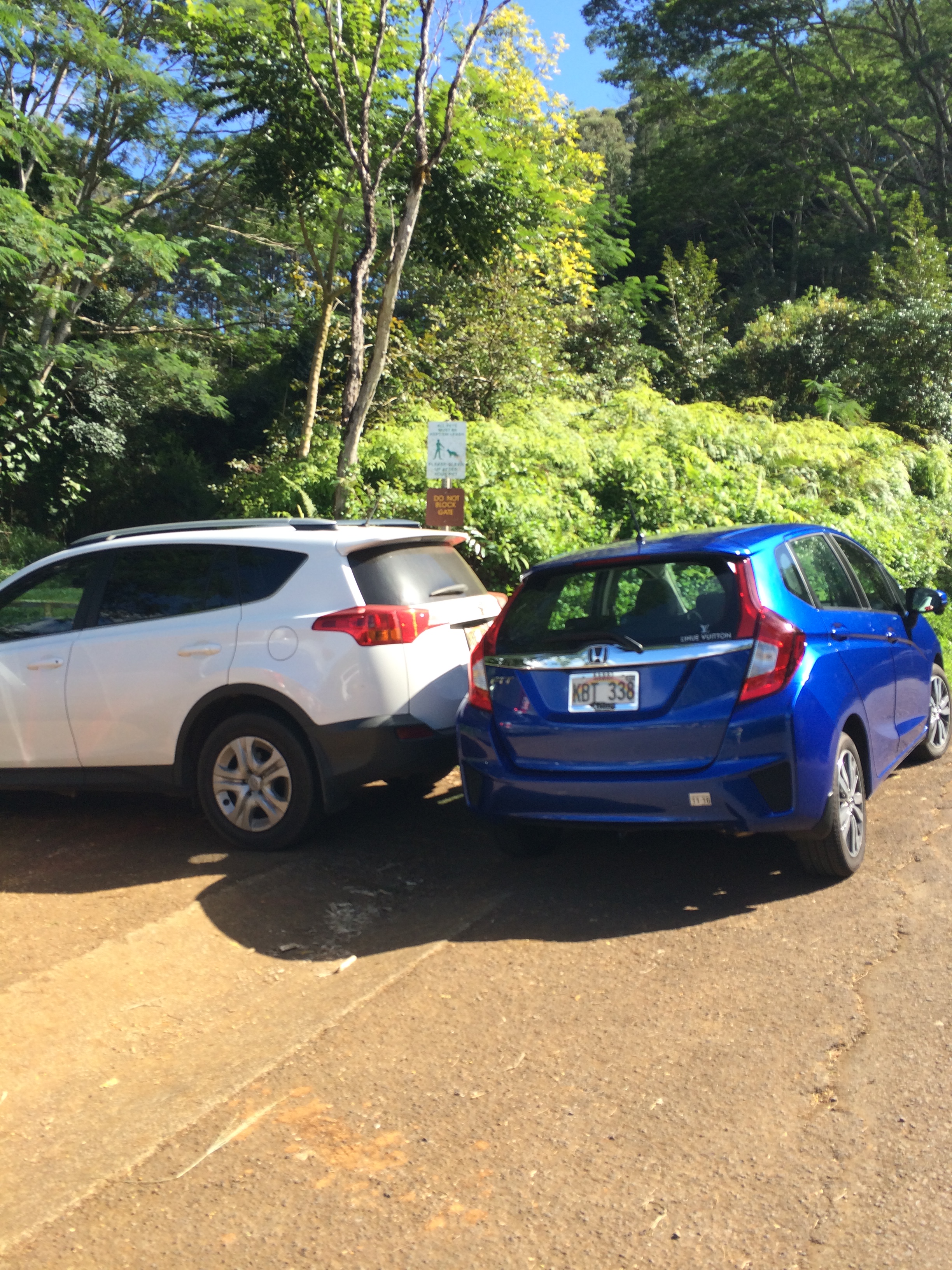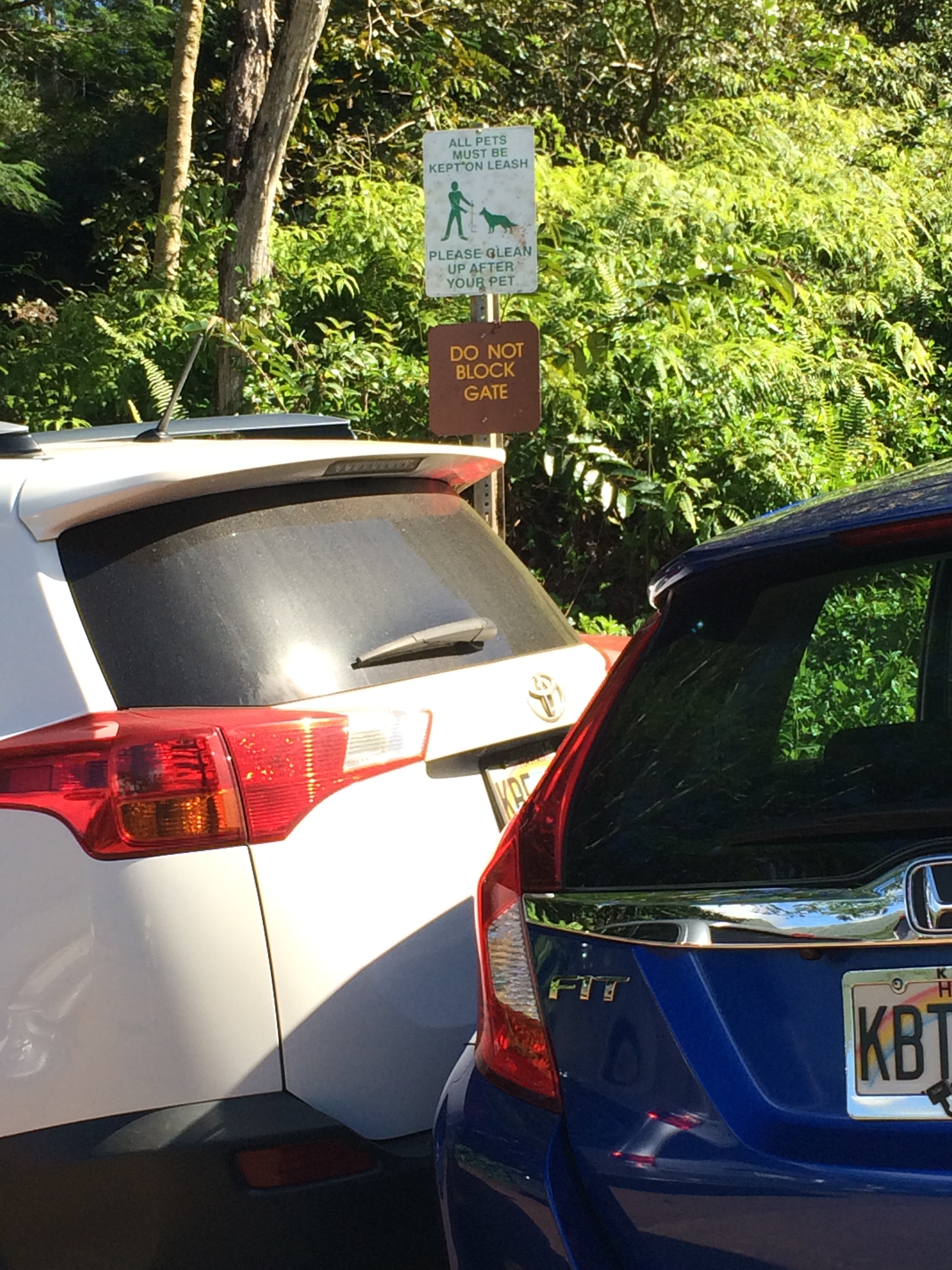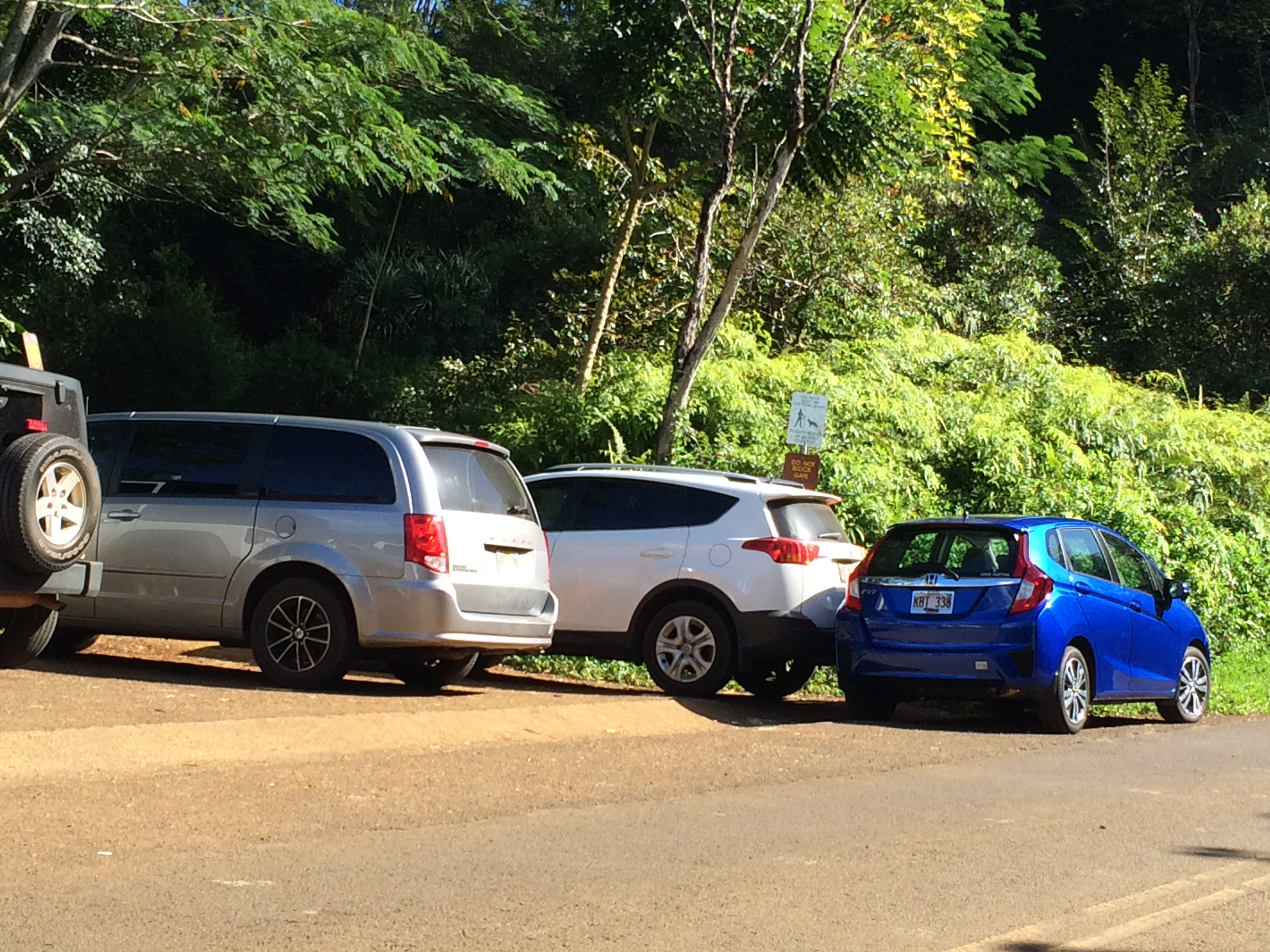 Steph, Vic, Eric, David and I hiked the Kuilau trail to the picnic table and back three days ago, Sunday, Jan. 10. It’s 2.5-miles round-trip. Let me take you back now to that Kuilau Trail hike three days ago with Steph and Vic. I’ll start with us trying to park…