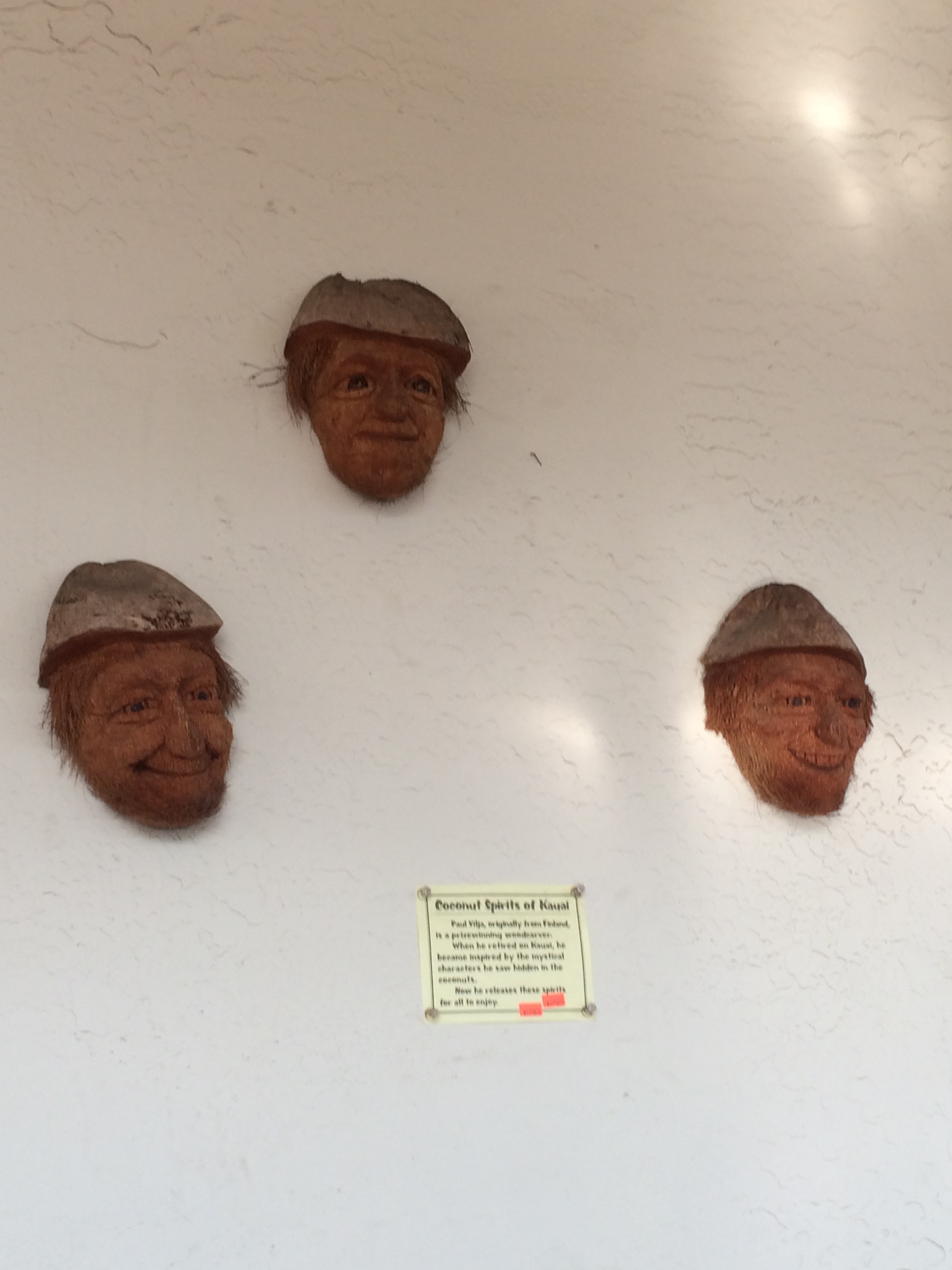 Sign says, ‘Paul Vilja, originally from Finland, is a prizewinning woodcarver. When he retired on Kauai, he became inspired by the mystical characters he saw hidden in the coconuts. Now he releases these spirits for all to enjoy.’