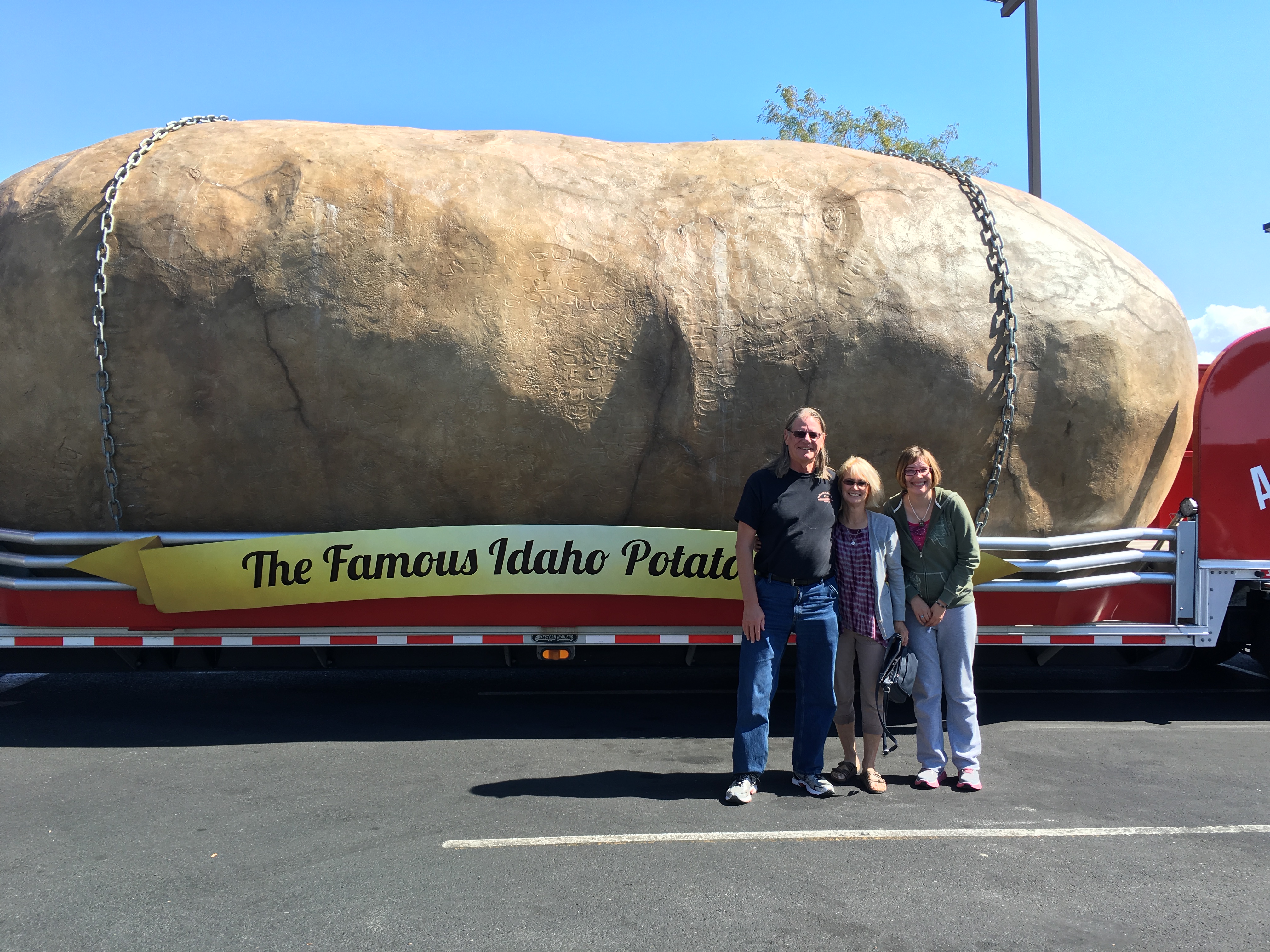 Yeah, so this 6-ton Idaho Potato made a stop in Idaho Falls, this past Friday. We stopped by to check it out and tried to get a selfie with it. Pretty hard to get a selfie of a 6-ton Idaho potato on a flatbed truck. First I tried to capture a photo of David and Megan with the whole rig: