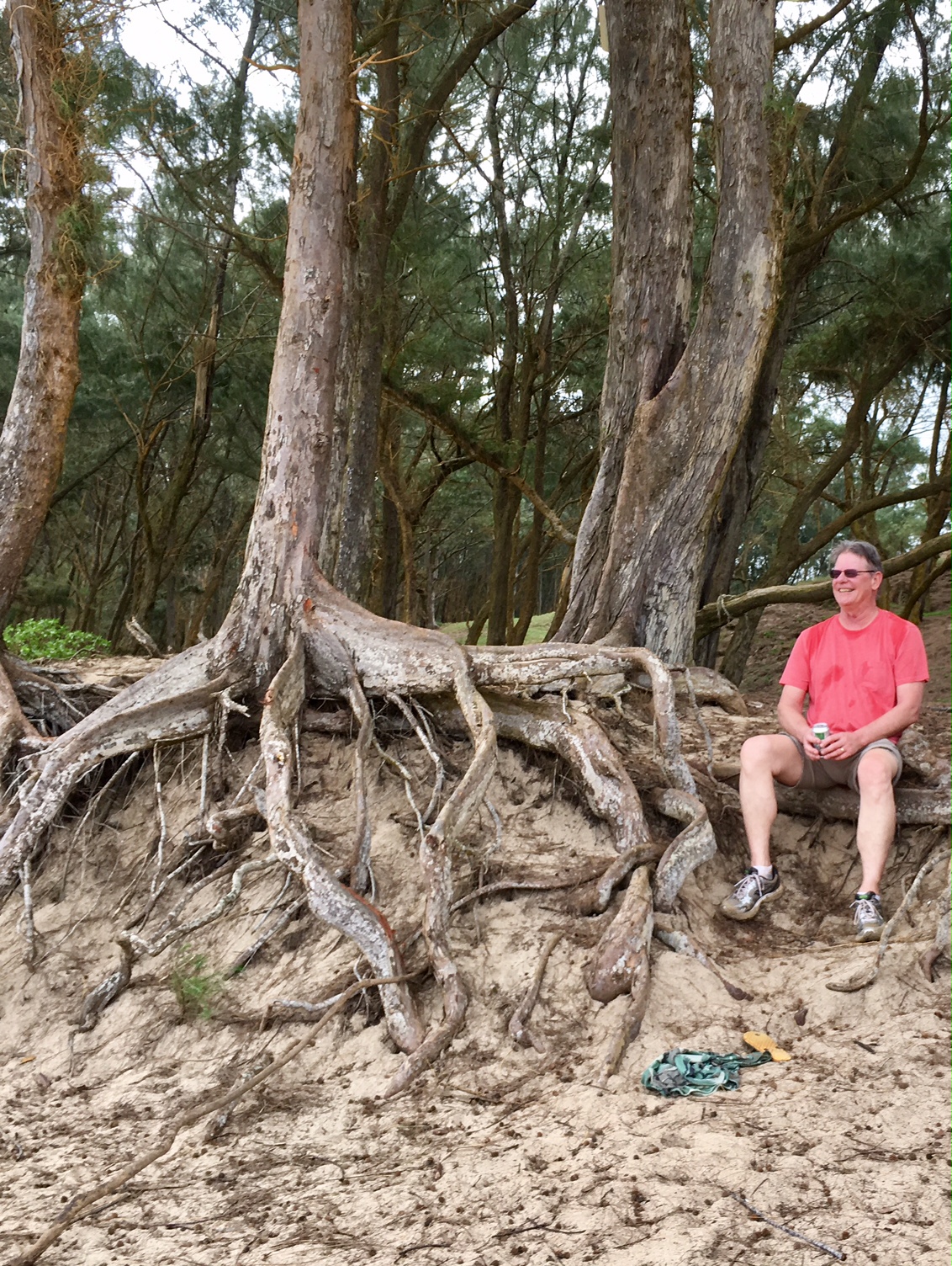 We’ve parked the car at the end of Koolau Road, a dirt road, and have reached the trailhead to the beach: