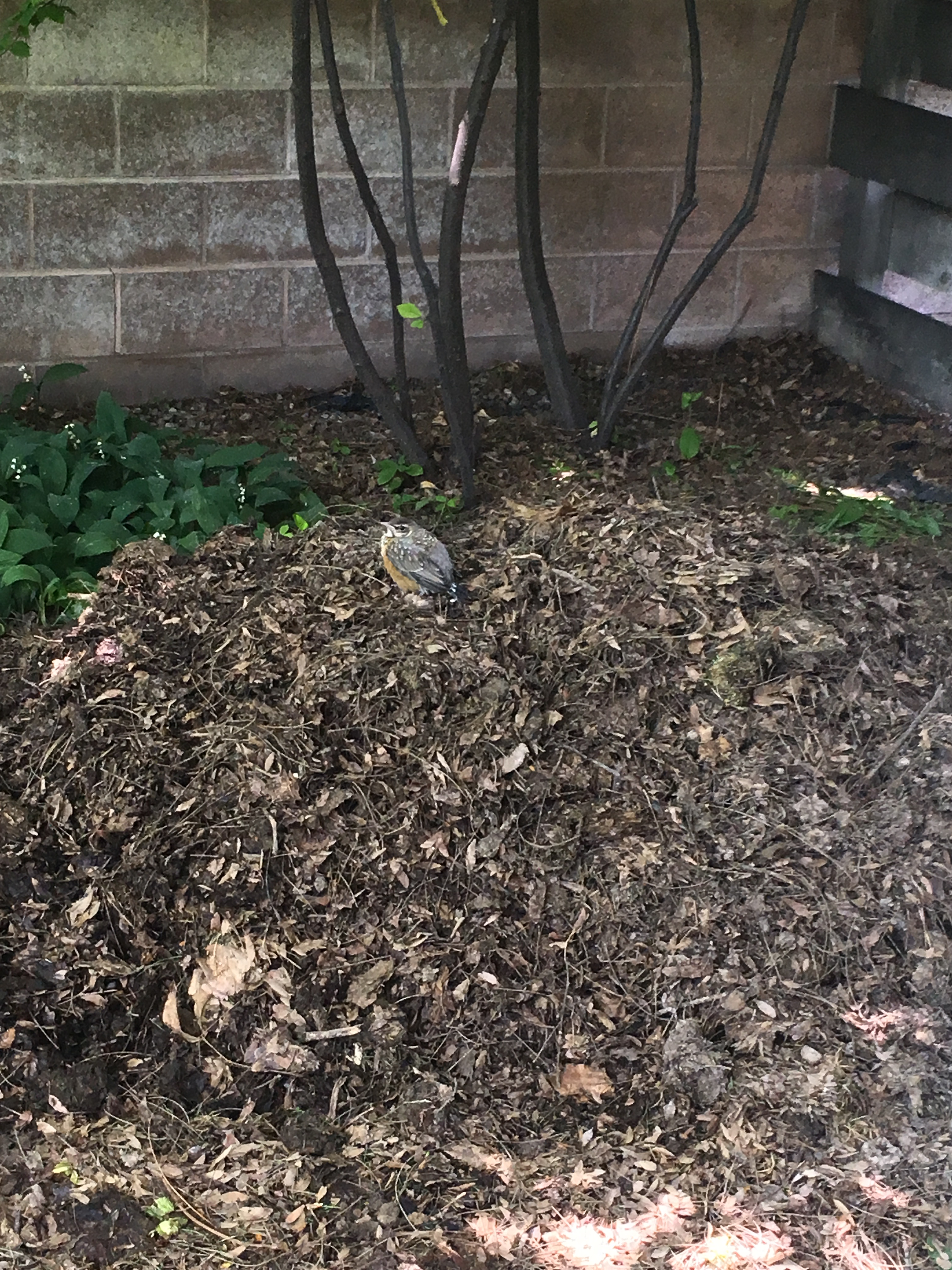 Part 2 of 2 – To continue where I left off … You might be wondering about the fate of that baby robin in our back yard that fledged about June 1. We discovered him on June 2, on our back compost pile with both parents close by. We woke up every day after that looking for that little guy, so tiny, vulnerable and dependent! He didn’t fly at all. He hopped a bit, behind his parents, begging for food, and hopefully would learn quickly to hop up onto tree branches for safety. My previous blog followed him through his first four days as a fledgling – my last video of him was on the evening of June 6, finding him safe and sound (whew!) after a huge thunderstorm.