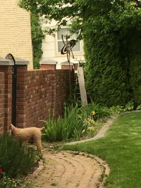 Well, he did fly up into a tree. Several days have passed and we haven’t see him. I guess the little birdie has flown away – has he joined the larger flock of robins? Are his parents raising another clutch by now? Do we have some hidden bird nests up in our giant honey locust trees somewhere? Huh. If we do, the wind did its best this past Wednesday and again Thursday (June 20), to knock them out!
