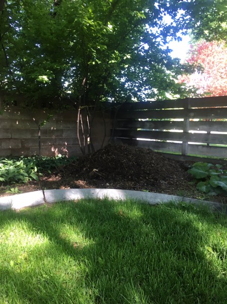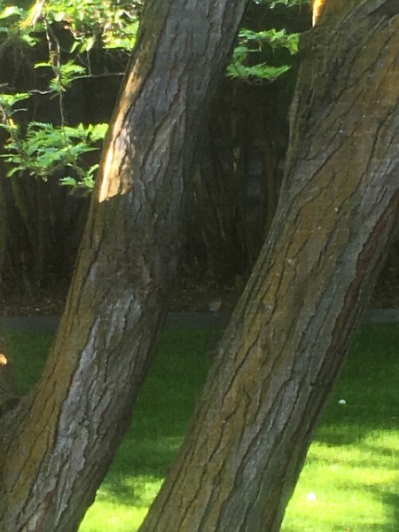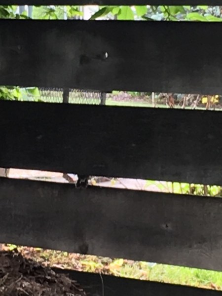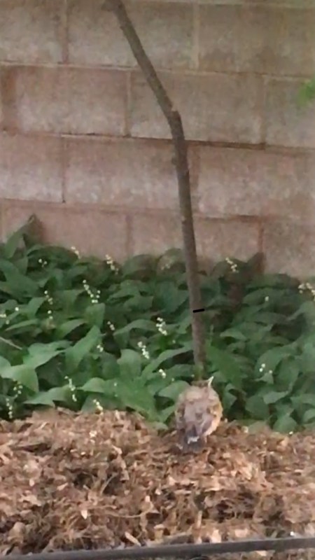 That video was taken Wednesday June 12 at 3PM. Yeah, so our little birdie has survived as a fledgling for at least 10 days! And he’s certainly not a strong flyer. I did see him sort of flit up into the lilac bushes once today. He was back out in the lilacs along our back property line again at 8:40 PM. Chirping away. “Daddy I need my bedtime snack!”