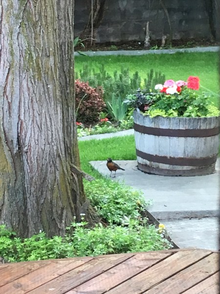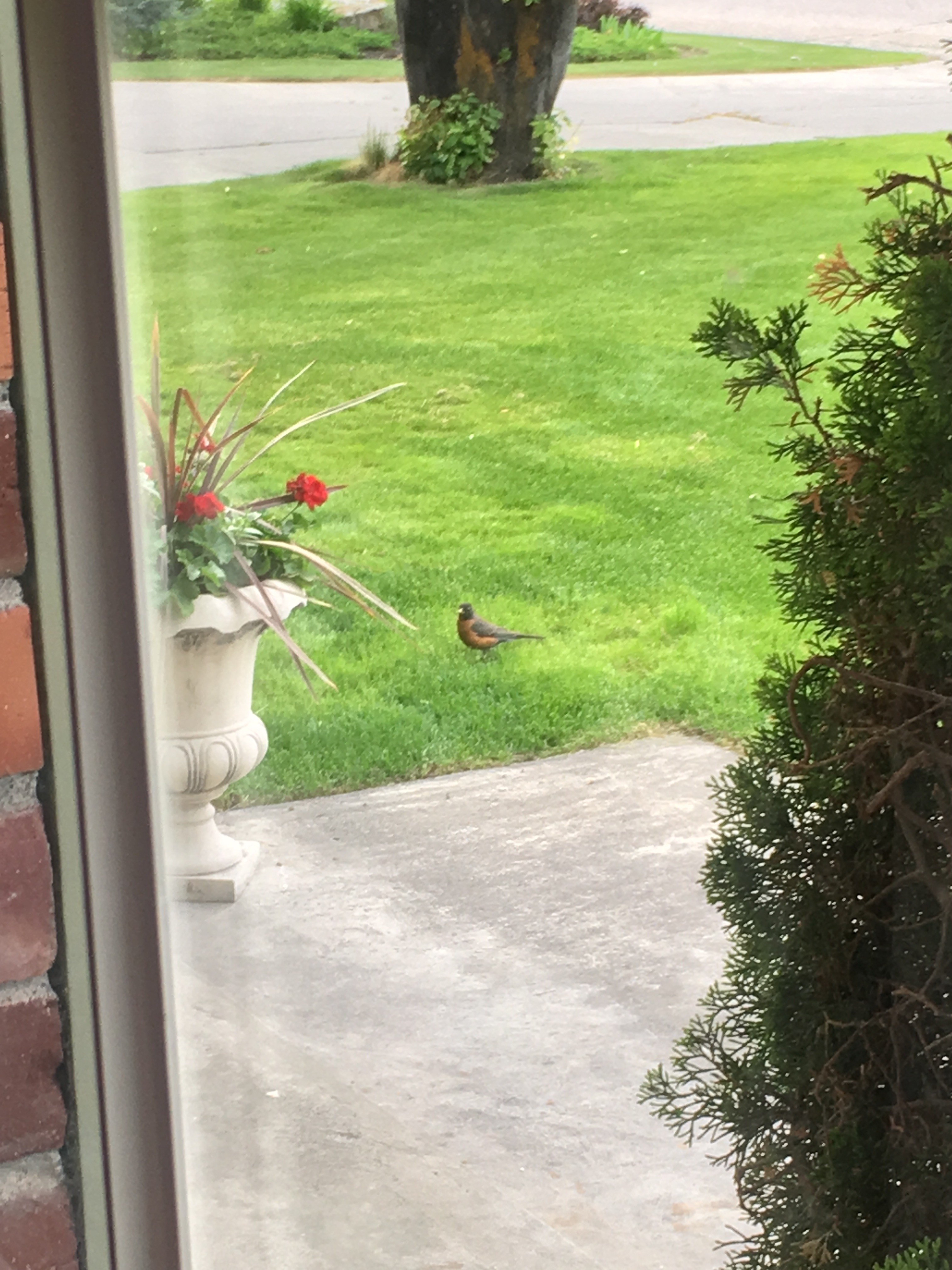 I just read today that 90 percent of baby robins don’t live through their first year. I am happy to report though, that our little robin was busy foraging for food just this morning in our back yard – Monday, June 24, a full three weeks after he fledged. I took a couple of photos of him. He still has that distinctive round light belly.