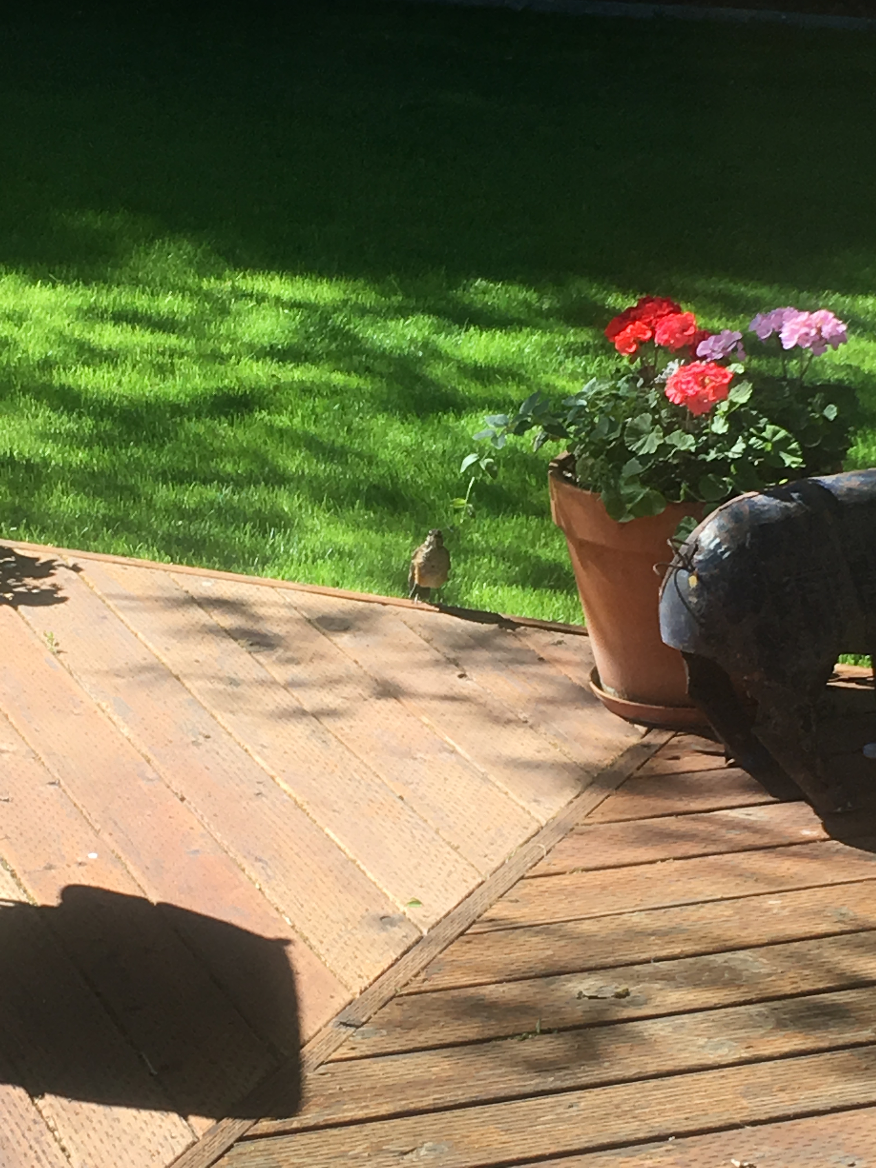 He disappeared into the corner of our yard behind our giant spruce tree but then was back out that afternoon pecking around for food (but mostly still begging from his parents). At 3PM I captured a video from inside our kitchen through our back door window. You don’t hear chirping on the video. What you hear is Rudy whining to be let out, and Megan’s friend Amber disciplining him to stop whining, which he does. I believe Amber to be some kind of dog-whisperer.