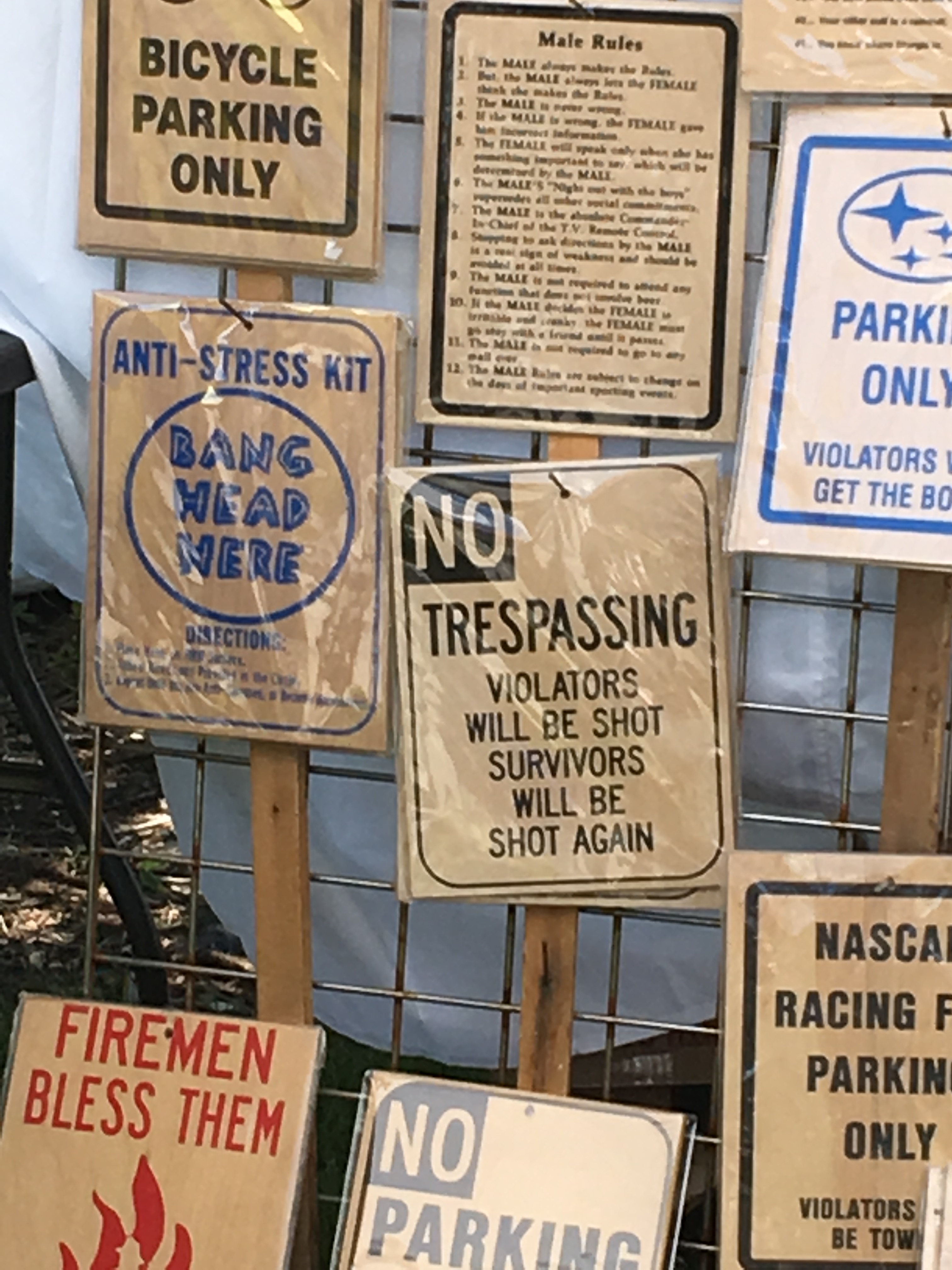 “NO TRESPASSING – VIOLATORS WILL BE SHOT – SURVIVORS WILL BE SHOT AGAIN” (??) Might be a big seller in this part of the country, based on the retail shop on the main drag across the street: