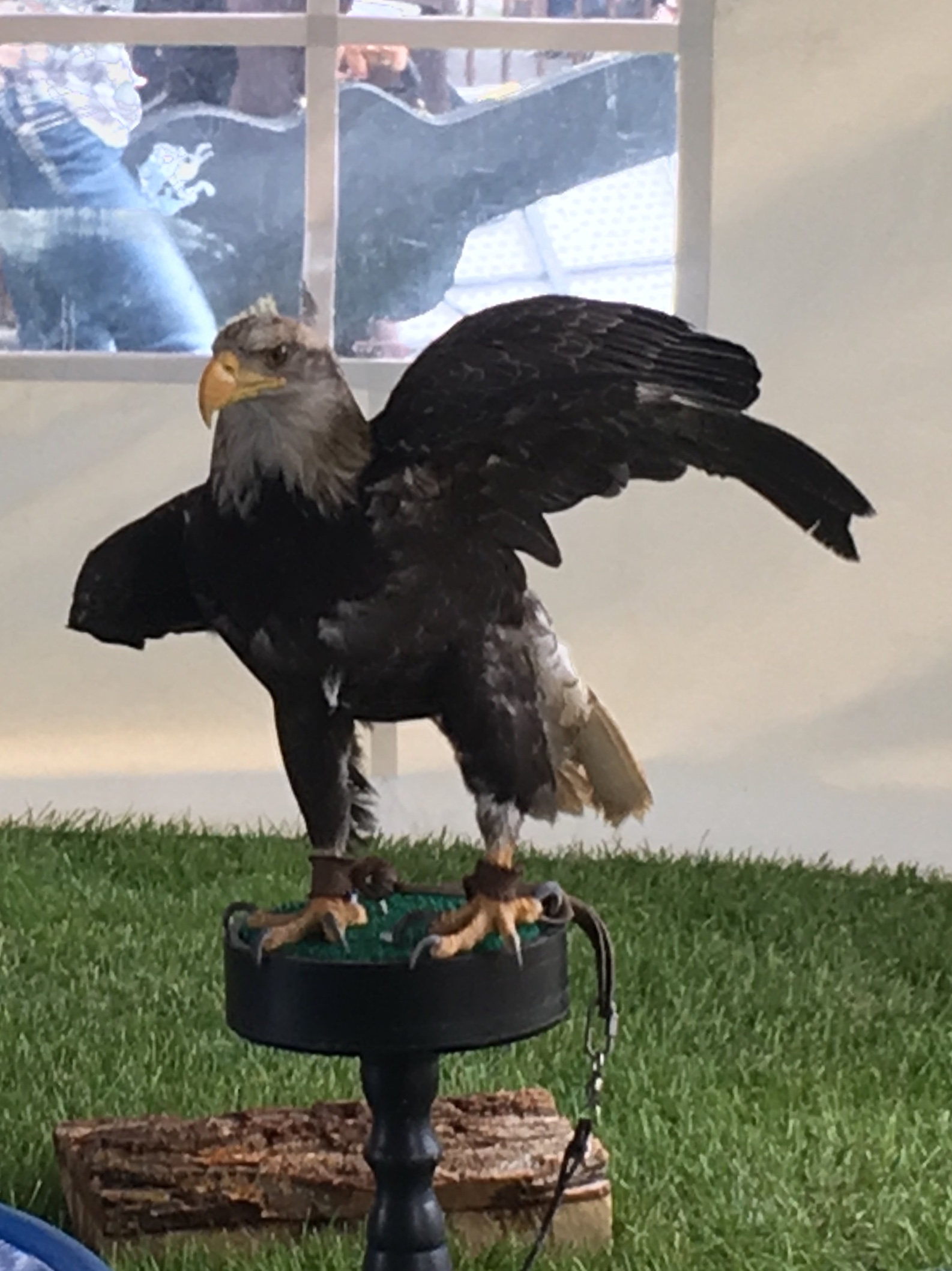 You can tell her age by the color of her head. It doesn’t turn completely white until the bald eagle is about five years old. This eagle is about four, which is why she has a salt-and-pepper-colored head.