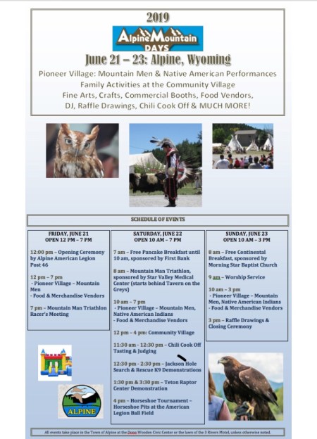 Every year the town of Alpine, Wyoming holds a Mountain Days Festival on the third weekend of June, a tradition which started over a quarter-century ago. This year it was held on Friday-Sunday, June 21st – 23rd. The festival includes Mountain Men, Native American Performances, live music, food vendors, commercial booths, a triathlon, chili cookoff, raptor show …
