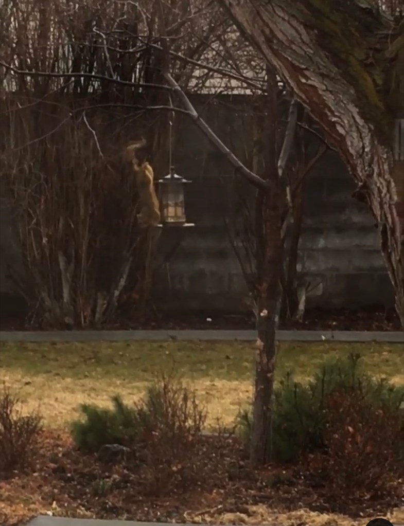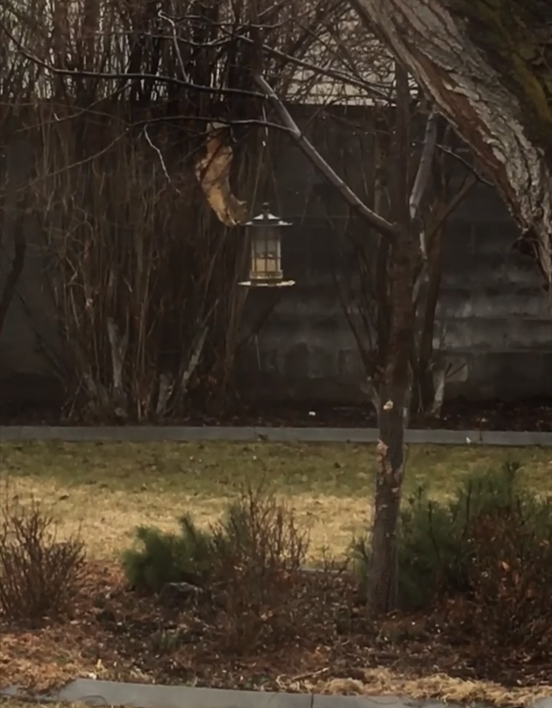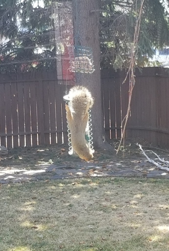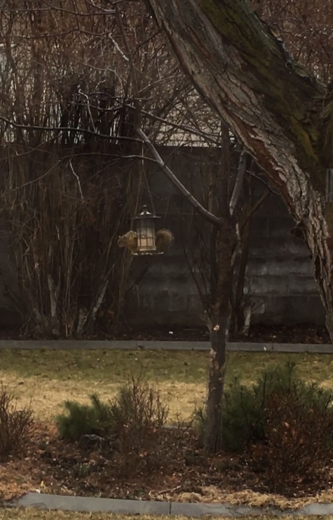 I captured a video of the squirrel from inside the house when our dog decided he was thirsty. A weird soundtrack. Don’t worry. The dog is not sloshing water from the dog dish onto your shoe and you really don’t have to let him out to chase the squirrel.