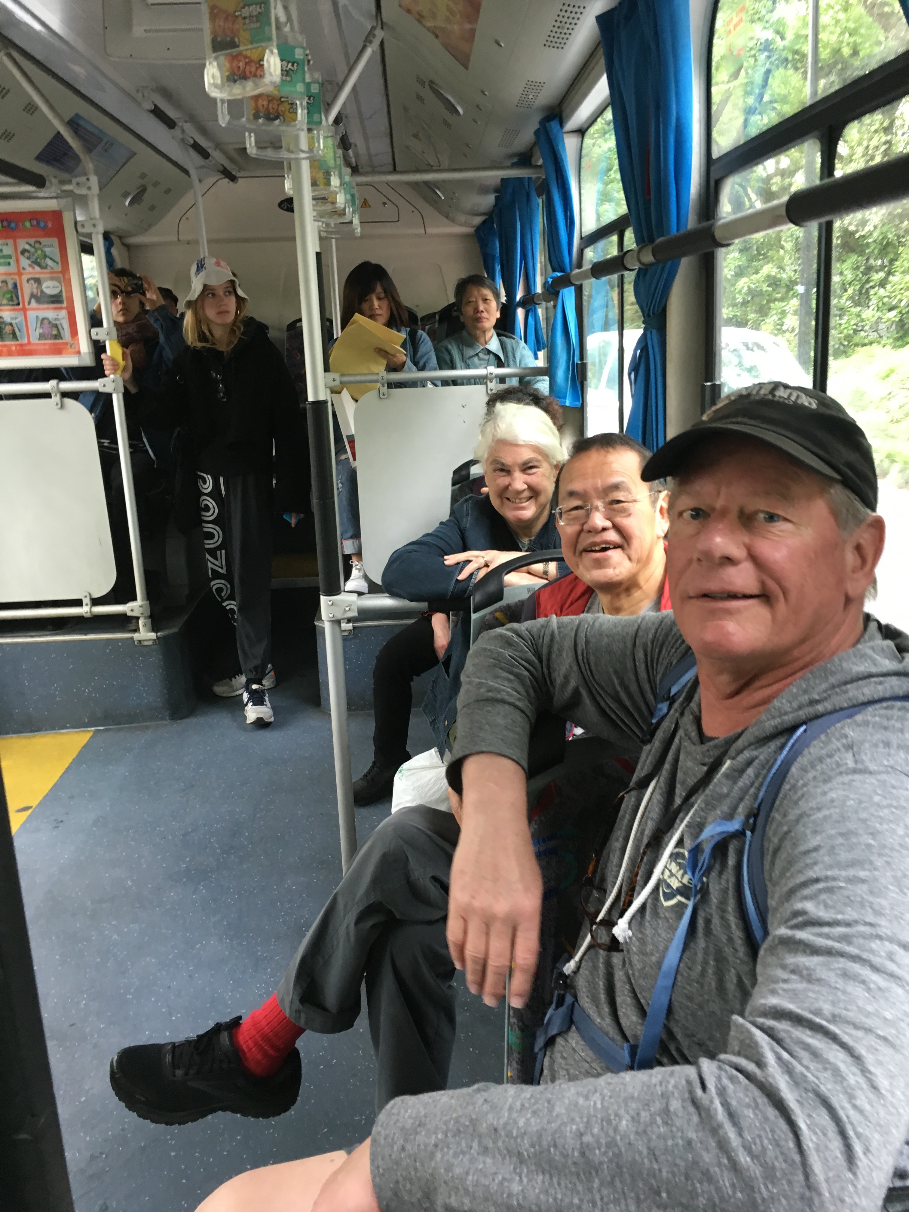 A pencil-thin young man dressed like a rock star in skin-tight pants and broad patterned glittery shirt, boards the bus with a suitcase. He’s here to go shopping!