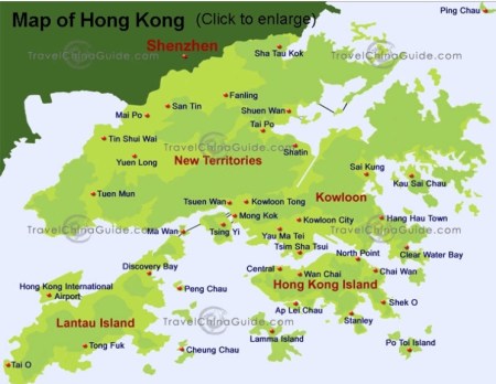 Hong Kong is split in two by Victoria Harbor; the modern city springs up along the northern shore of Hong Kong Island and the southern tip of Kowloon (the peninsula extending from the Chinese mainland). On Hong Kong Island the central city goes only a few kilometers south into the island before mountains rise up.
