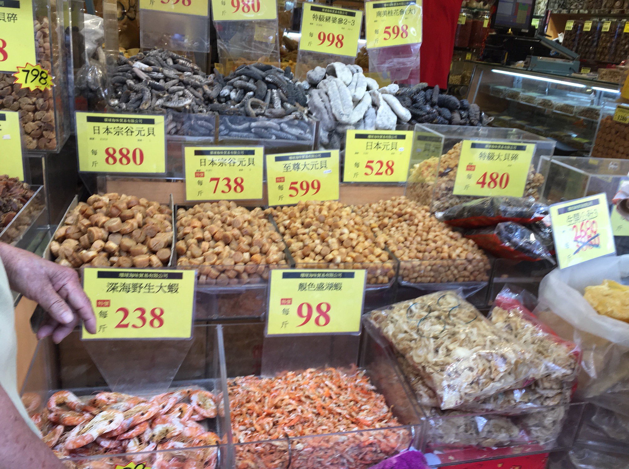 There’s a whole block of Hong Kong where you can purchase dried fish, displayed on shelves in open bins. (It doesn’t spoil sitting out in the heat all day?) I recognize the shrimp!
