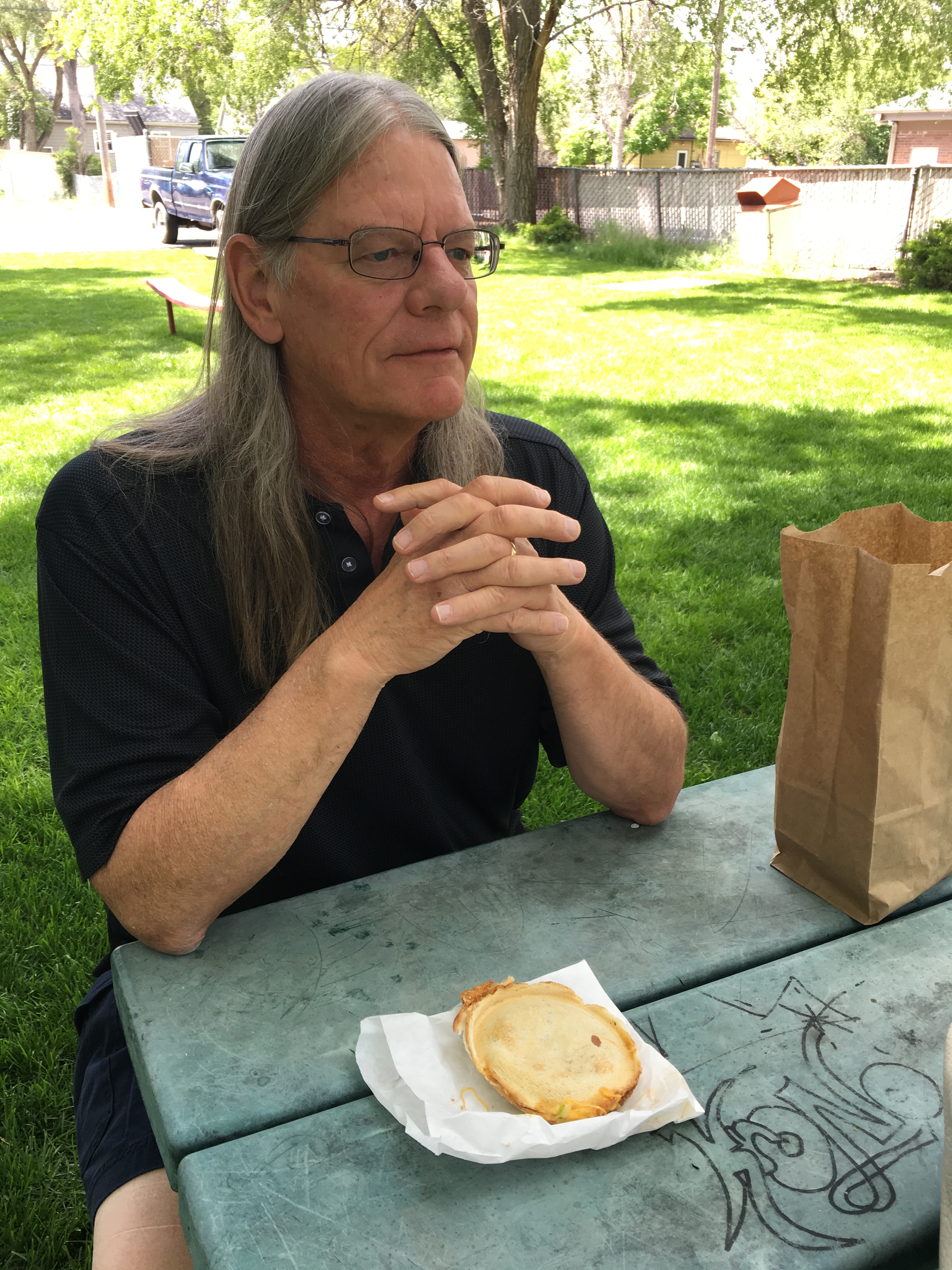 We head outdoors to a picnic table with our Space burgers.