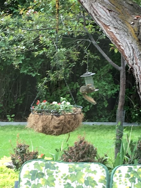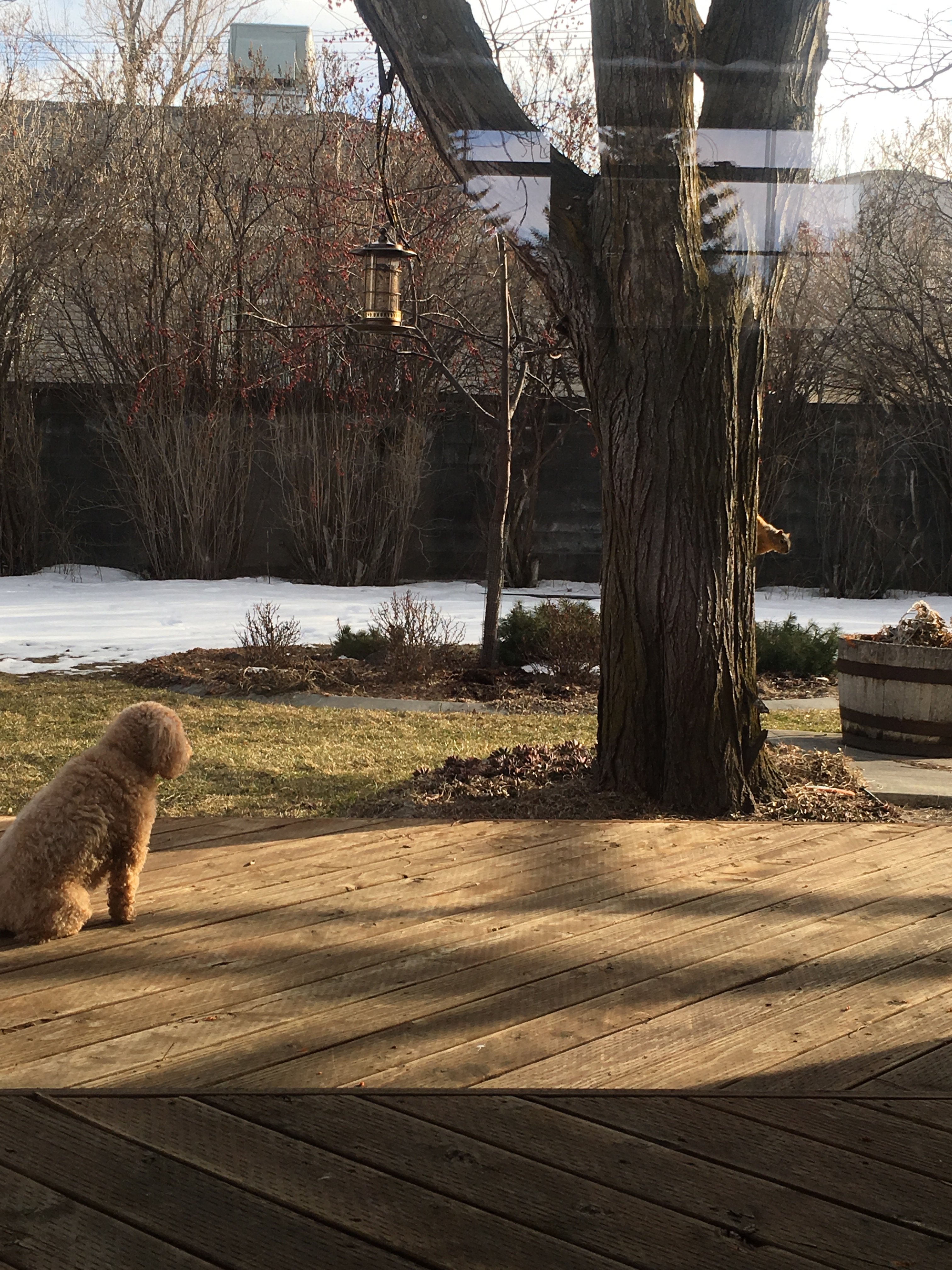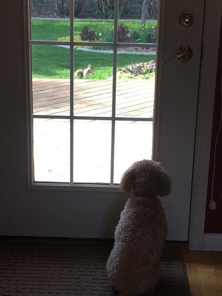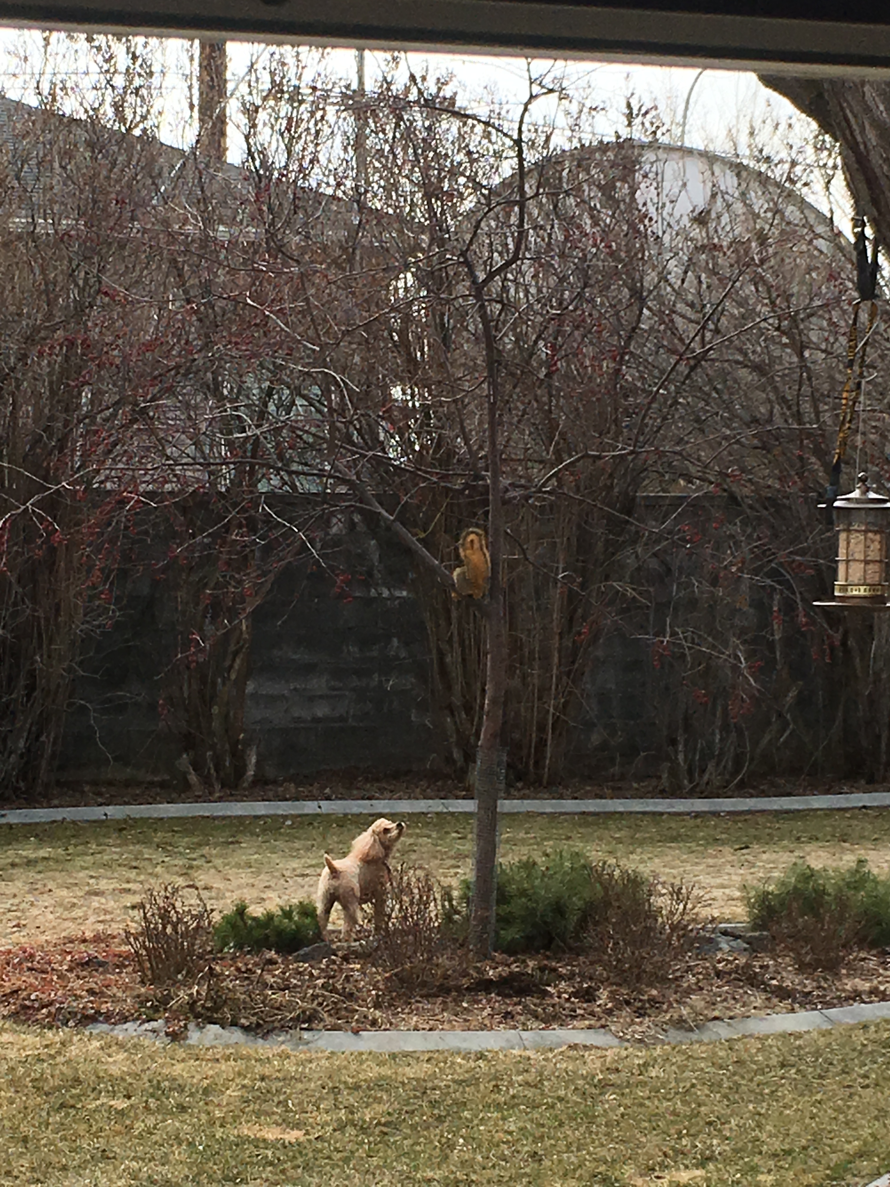 Einstein is an escape artist. It’s simply impossible for his owners to keep him in their fenced back yard. They have given up. You will see in the video the ladder we propped up against the fence beside the arborvitae three summers ago to keep Einstein from jumping directly from his back yard into our garden. But, no matter. He simply jumps their fence and once he’s escaped his yard, we obviously can’t keep him out of ours.