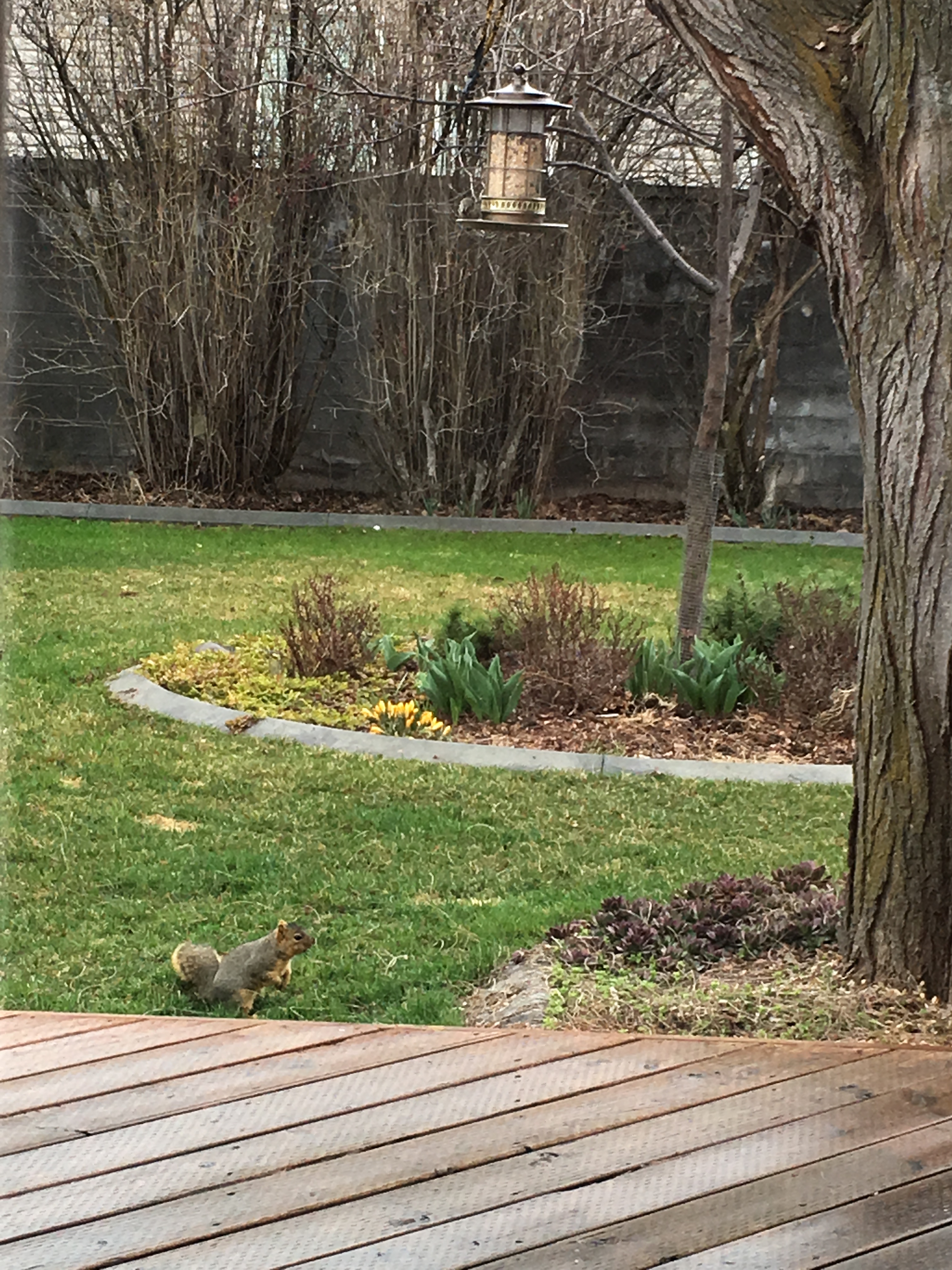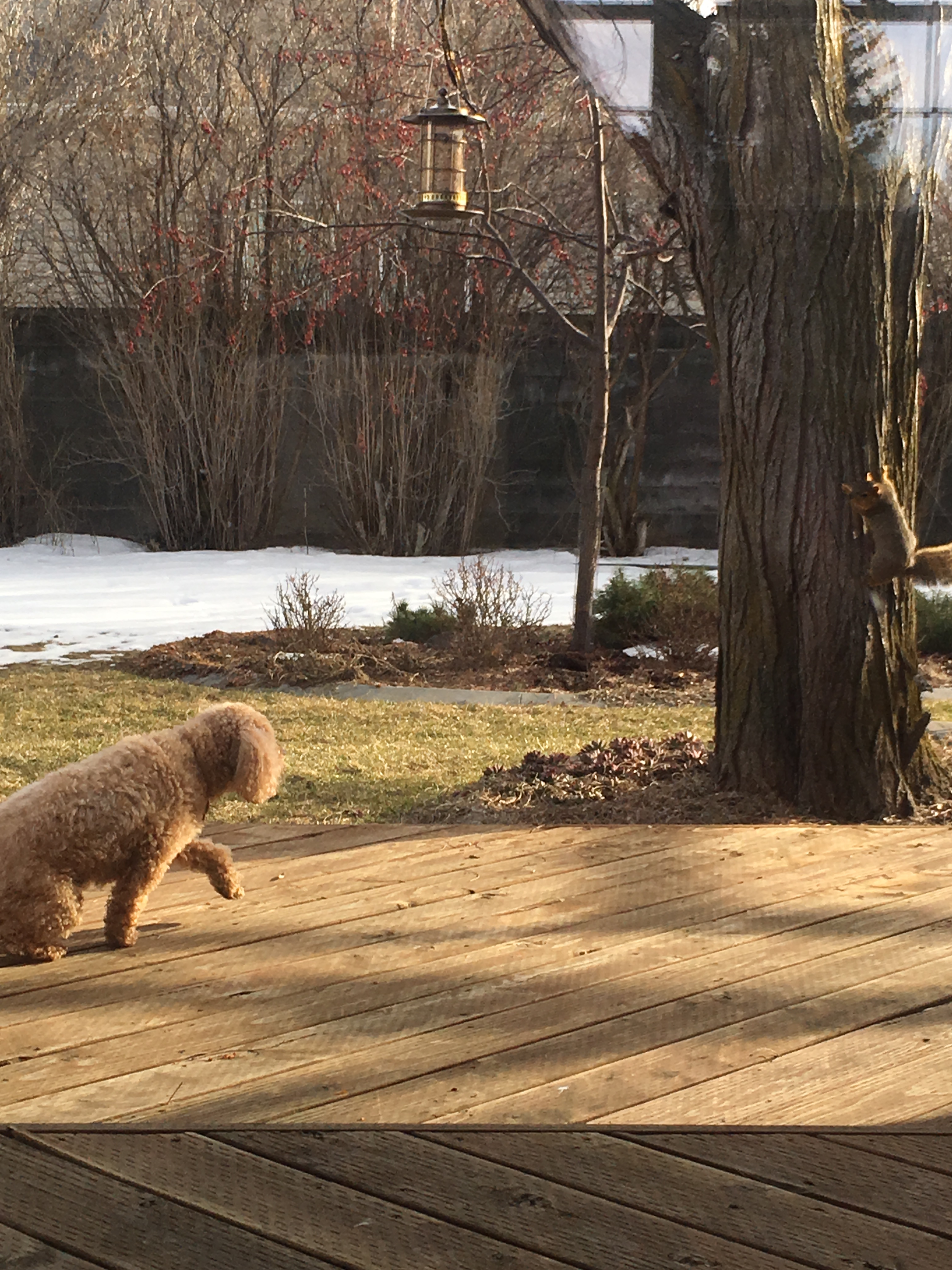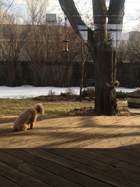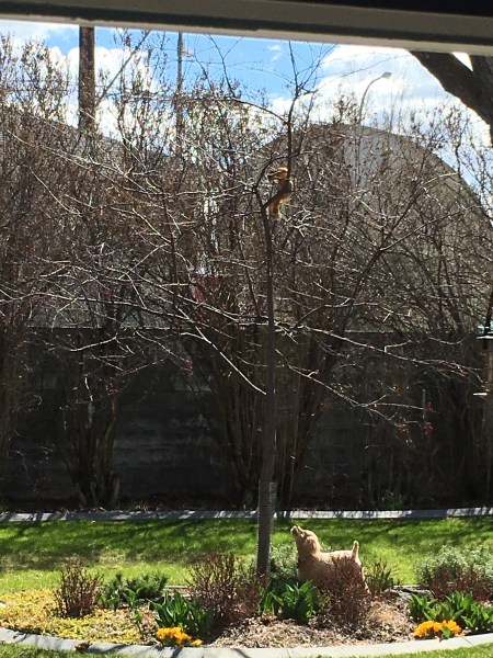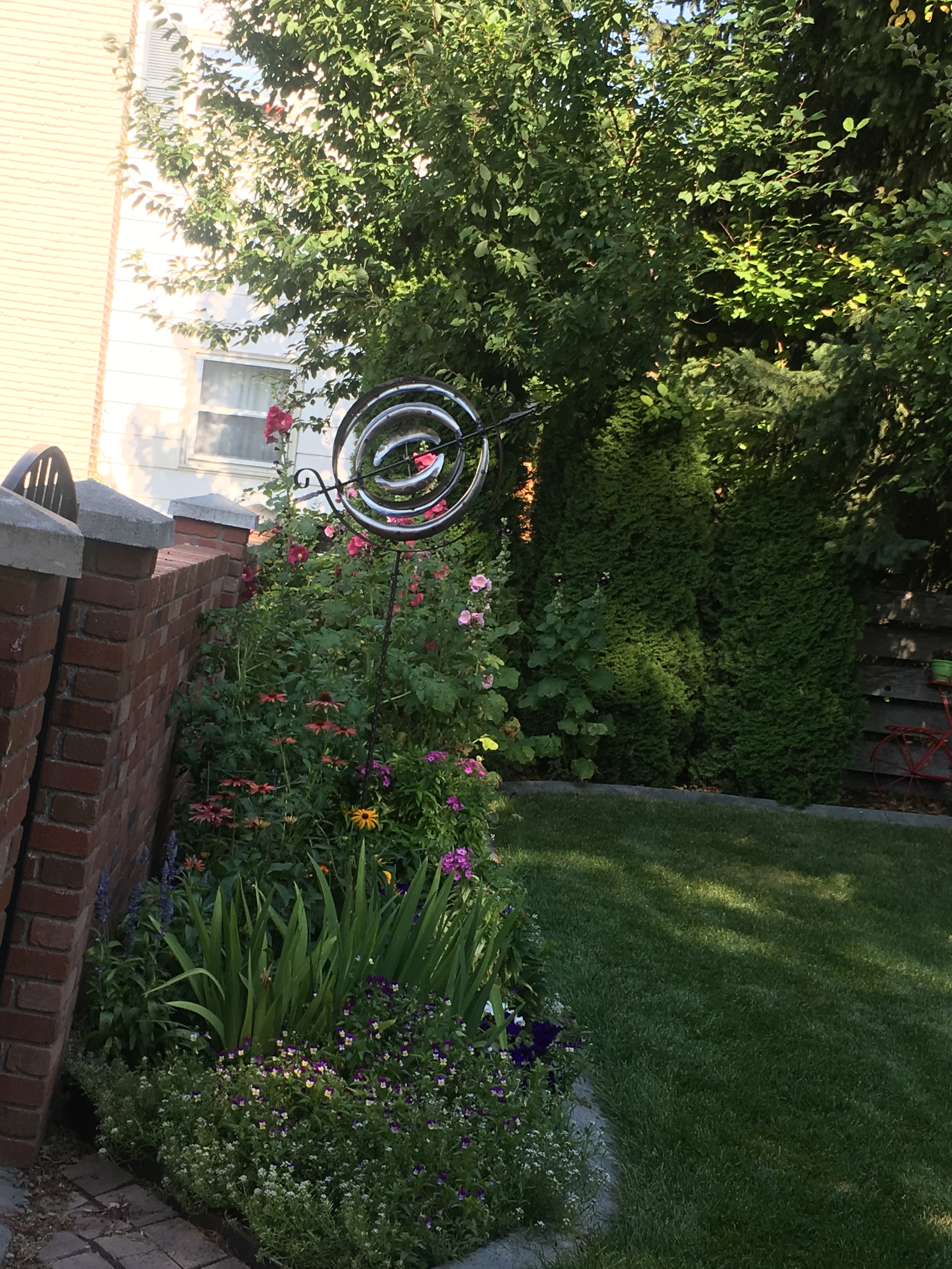 I’ll have you know, we think we’ve made some progress in discouraging Einstein’s over-the-fence leaps directly into our garden with the installation of a wind vane whirly thing we bought at my brother Eric’s shop.