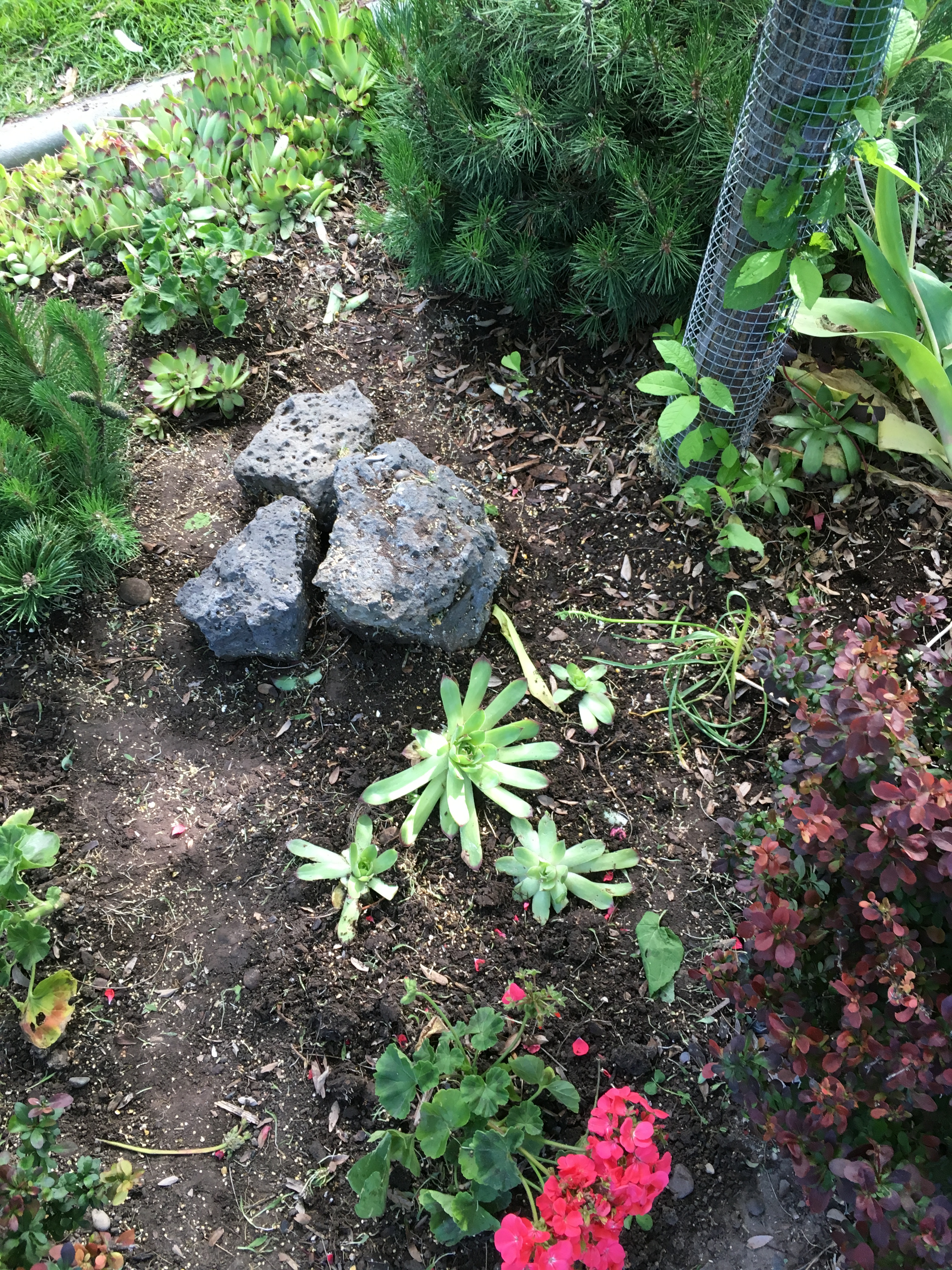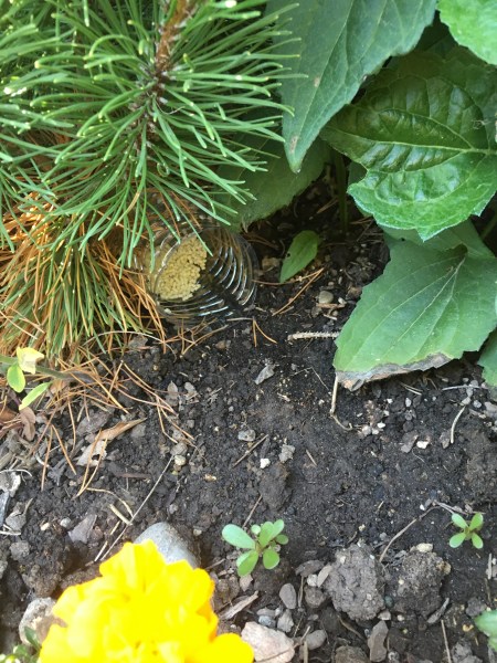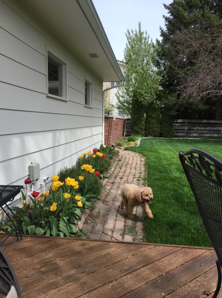 By the first of June the flowers were all planted in our pots and flowerbeds – marigolds and zinnias, impatiens, petunias, red and blue salvia. Tomatoes and green peppers. Let the battle begin! You know, against slugs, fungus, heat, insects, weeds, crowding, drought, poor soil, under-fertilizing, over-fertilizing, over-watering, not enough dead-heading. And one more pest – our next-door neighbor’s dog, Einstein. Here – I’ve captured this ‘pest’ problem in this video: