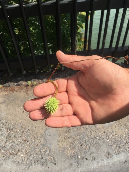Chestnuts coated in prickly spikes (Huh. that sentence rings like a new verse for ‘White Christmas.’) I picked a developing horse chestnut to show you, but it was too prickly to put in my pocket. David held it long enough for me to take a photo.