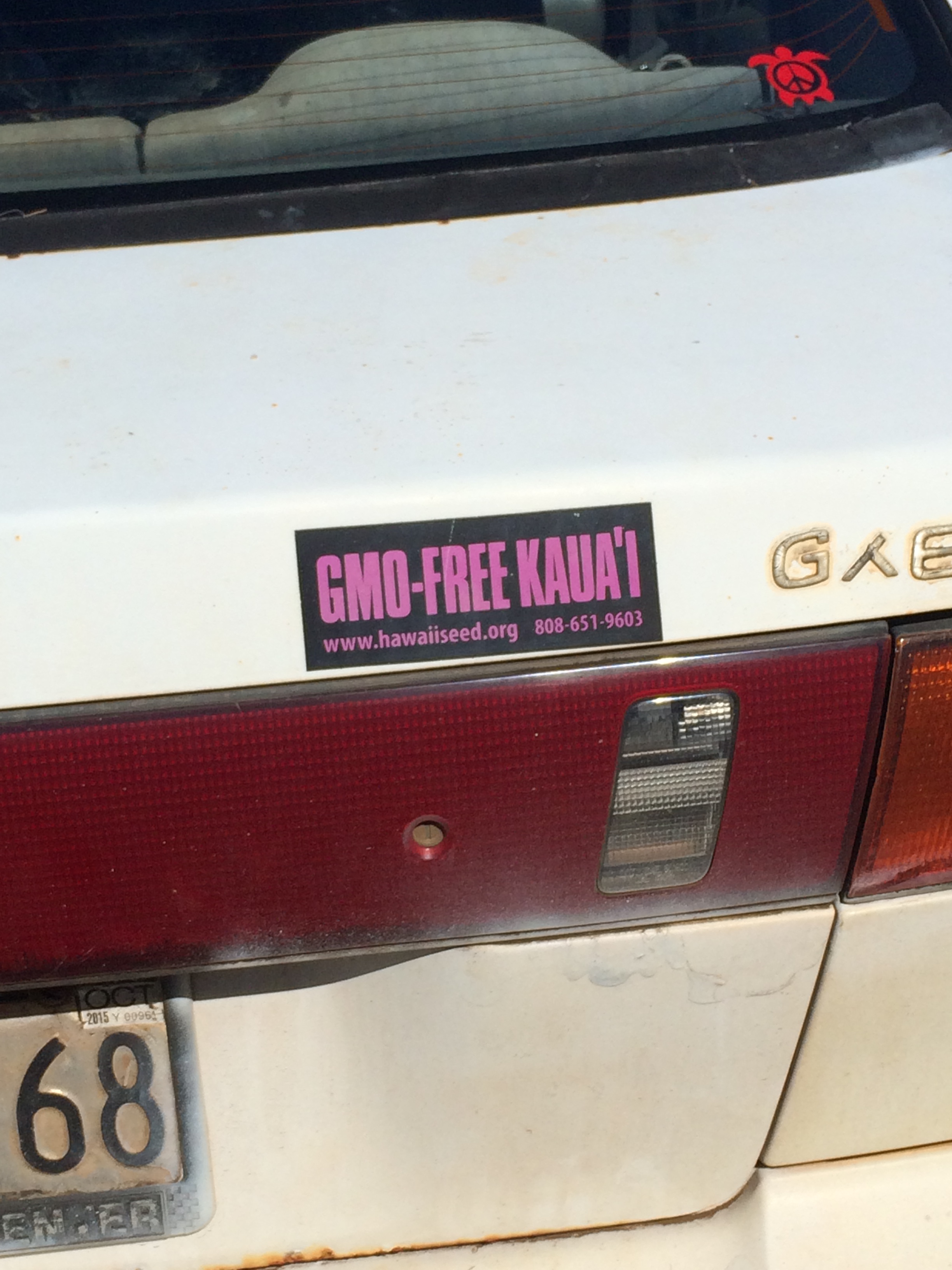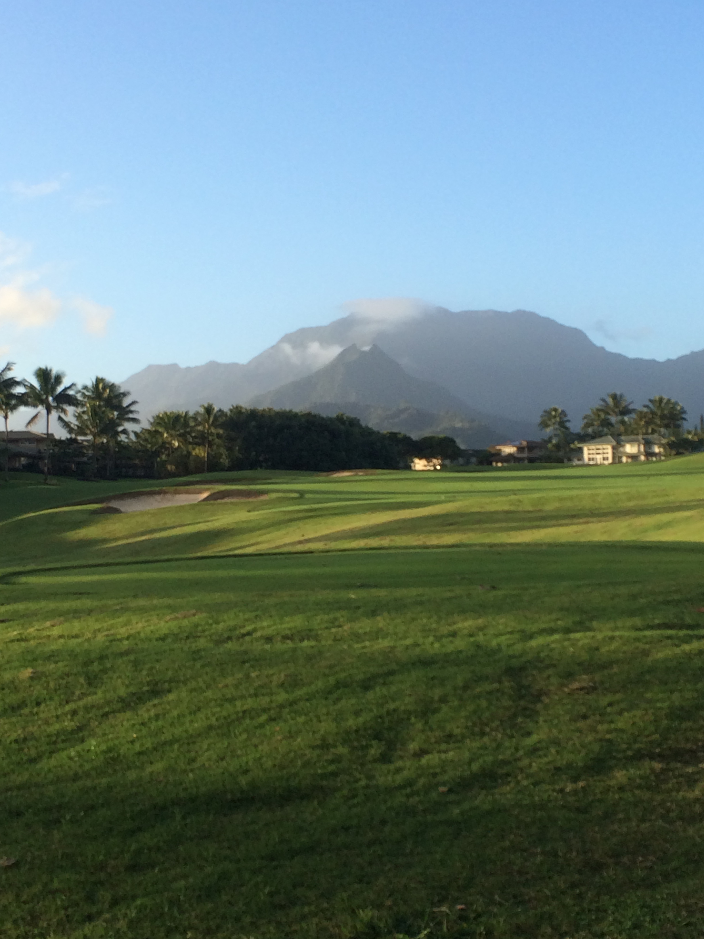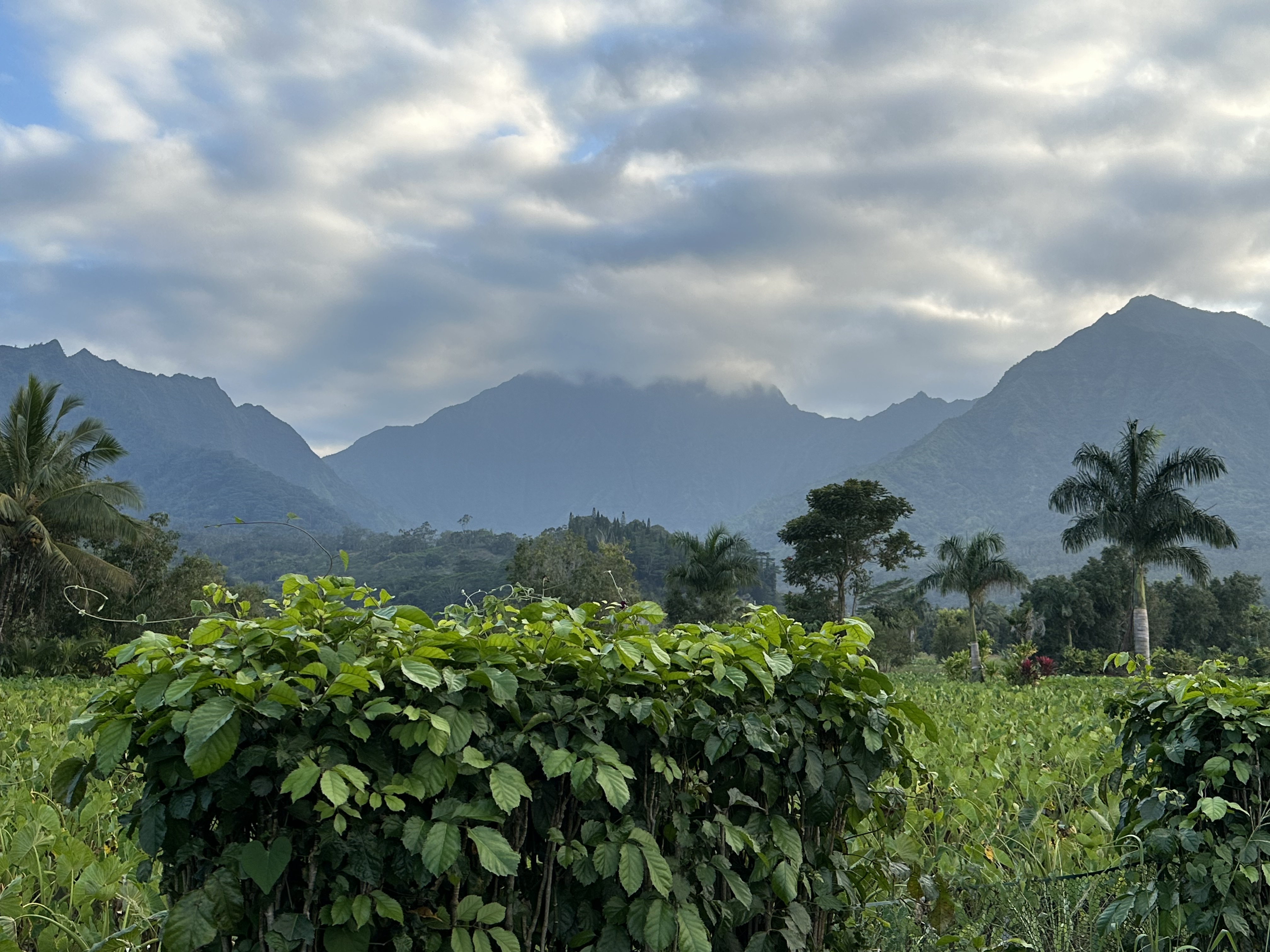 We pull up in the parking lot behind the Hanalei Market. I’m always dragging behind. But when I climb out of the car I can’t help but take a photo. Check out the view!