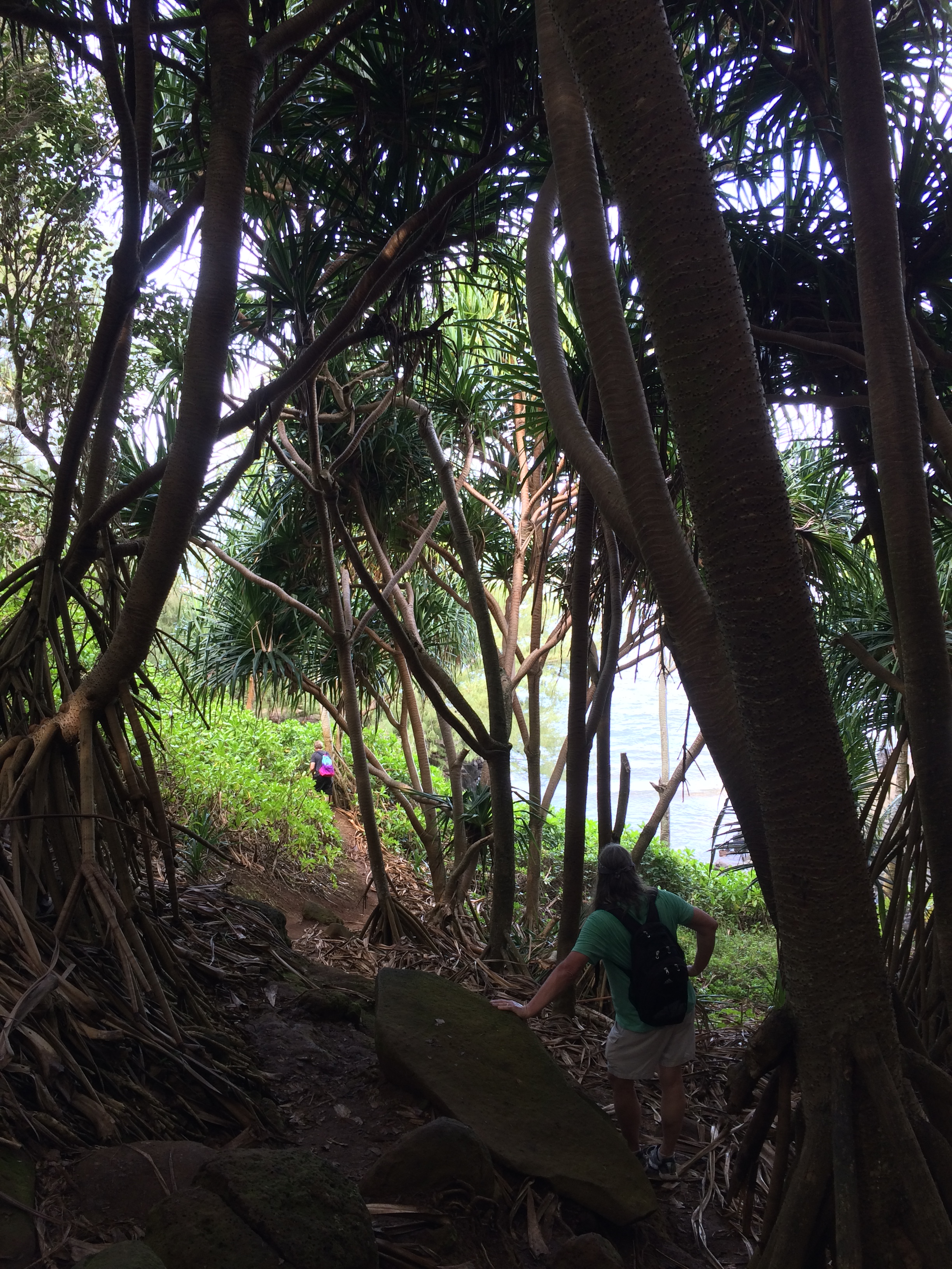 Our last hike was on the Club Med Ruins path in Princeville on the north shore where we enjoyed gorgeous views of Hanalei Bay from the east and checked out the surfers. Well now we are in Hanalei Bay walking the beach. Here you see a view of the ‘dock of the Bay’ looking north – that greenery in the background is where we were walking yesterday – where the failed Club Med and other resorts were never built.