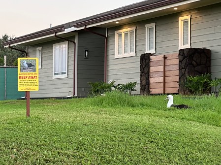 We always encounter albatross when we visit Steph and Vic in Princeville because there are usually a few nesting albatross on their street. Sure enough, this year there are two nesting albatross right in the yards of a neighbor 3 doors down. I took this photo from the street just walking past it.