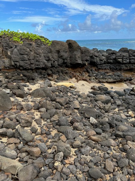 We encountered a monk seal too. Do you see it in this photo? Look in the sand.