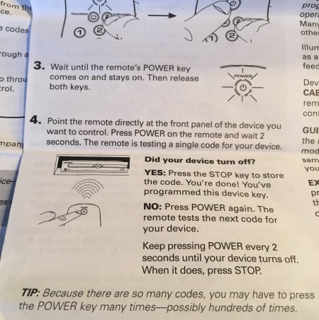 Note the tip in fine print at the bottom of step 4: TIP: Because there are so many codes, you may have to press the POWER key many times – possibly hundreds of times.