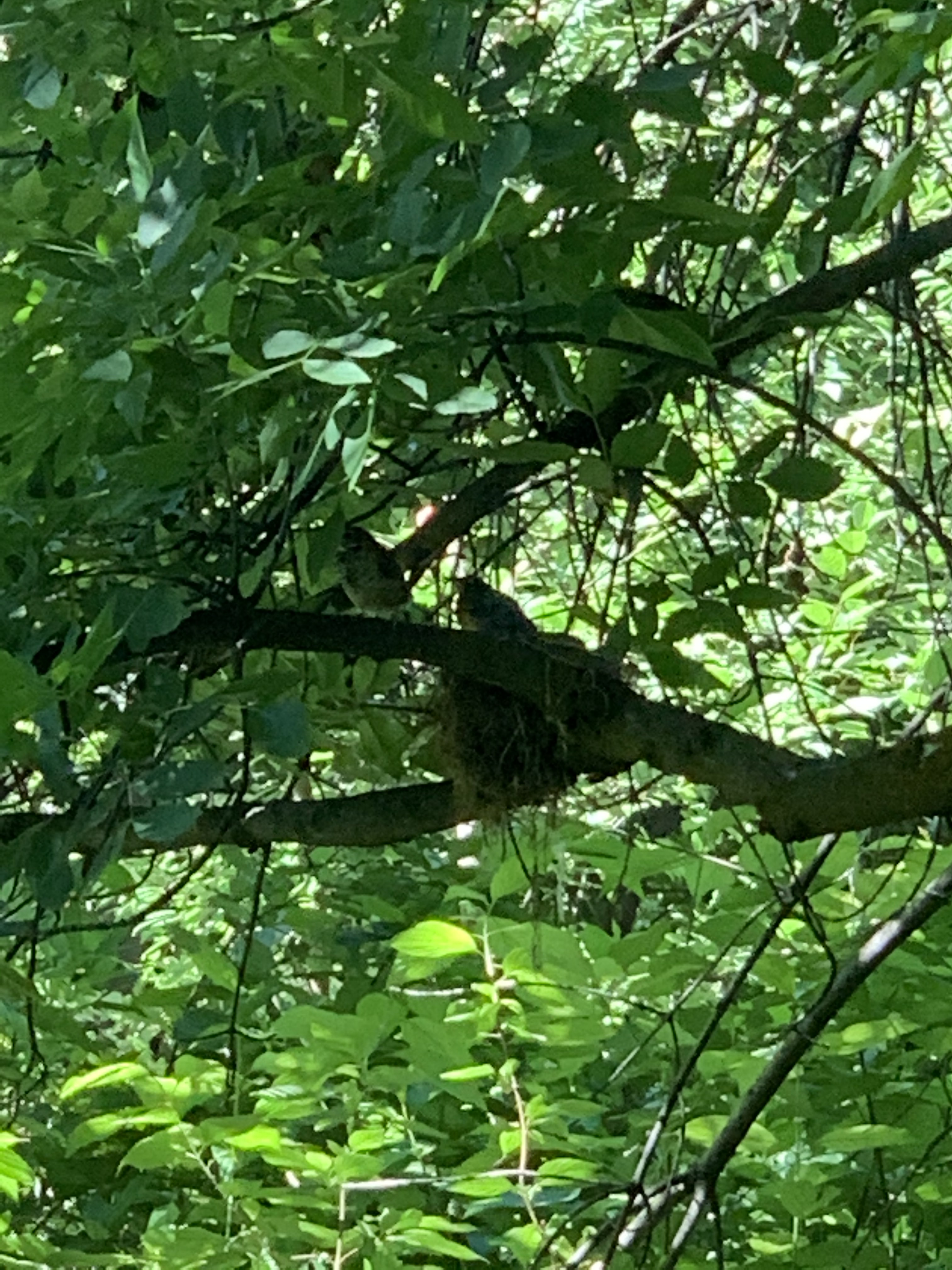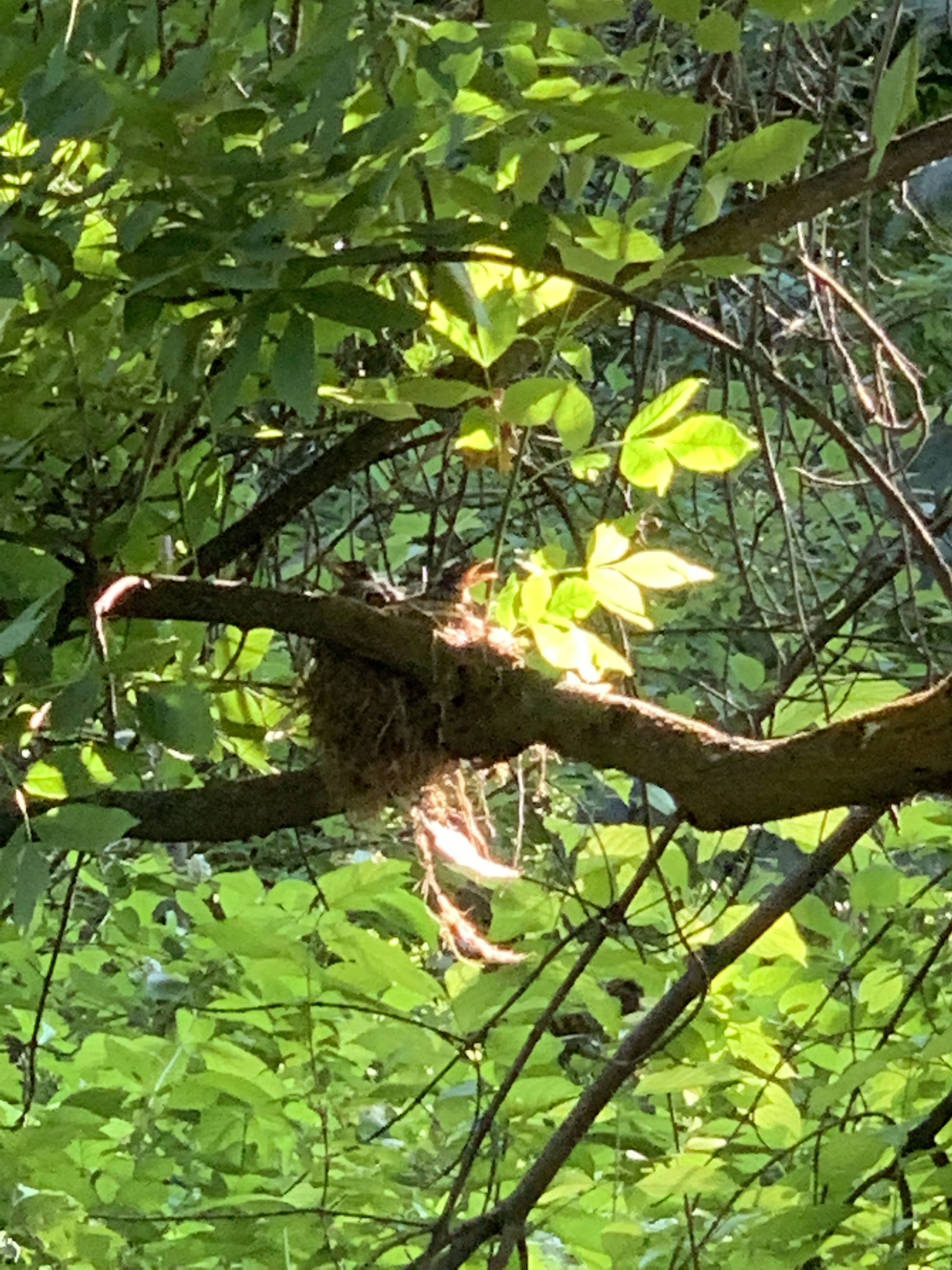 My last blog (Part 3 of the robin story) left off on July 12. One of the babies fledged on July 11, and the second one still hadn’t fledged by early evening on July 12. But on the morning of July 13, the nest was empty. The second robin had fledged sometime after 7 pm on the 12th! Where was he? (BTW – to keep things simple I’m calling all the robins “hims” – please, no offense ladies.)