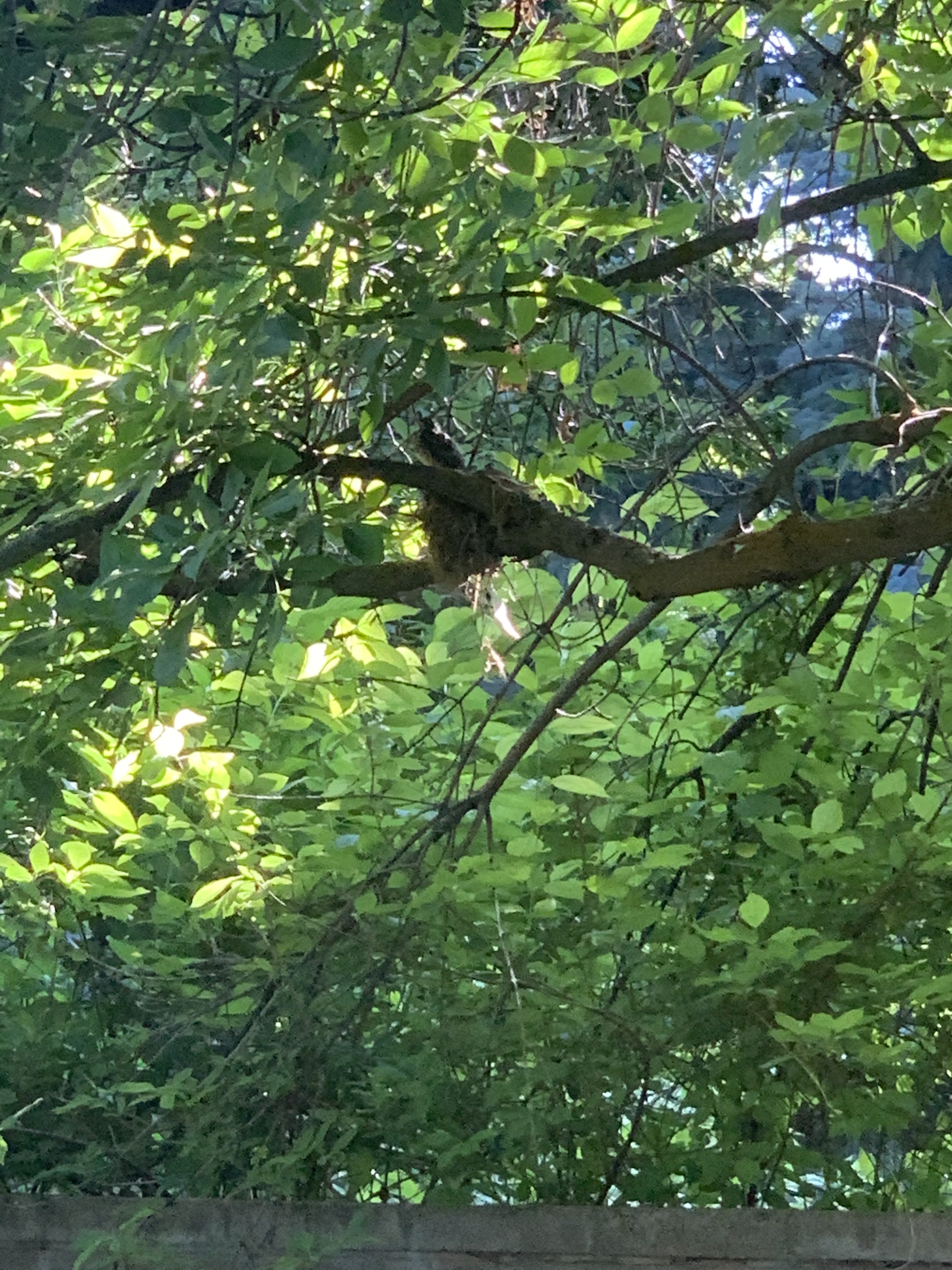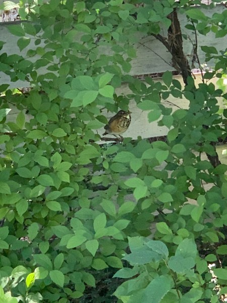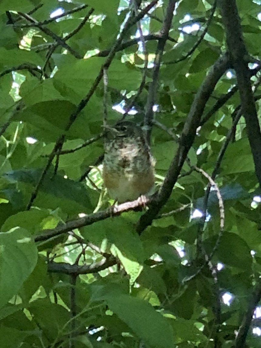 He stayed perched in that bush for over six hours, his parents flying to him to feed him. The other baby showed up on the west side of our yard. Boy those parents were busy. I fear this may be the last I saw of this little bird, as the next day and all the days going forward we saw only one baby robin.