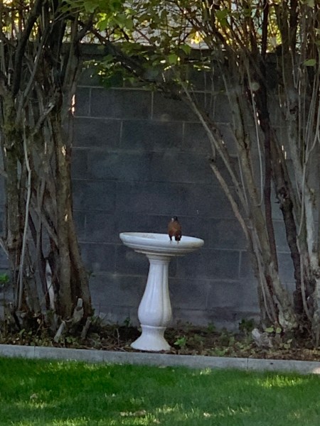 Into September we started seeing six or more robins in our back yard at one time. We’d run the sprinklers and a large group would be out there scavenging, cleaning up the ‘debris’ that had been washed up out of the lawn. A robin landed on the bird bath and was chased off! Our family was protecting their territory.