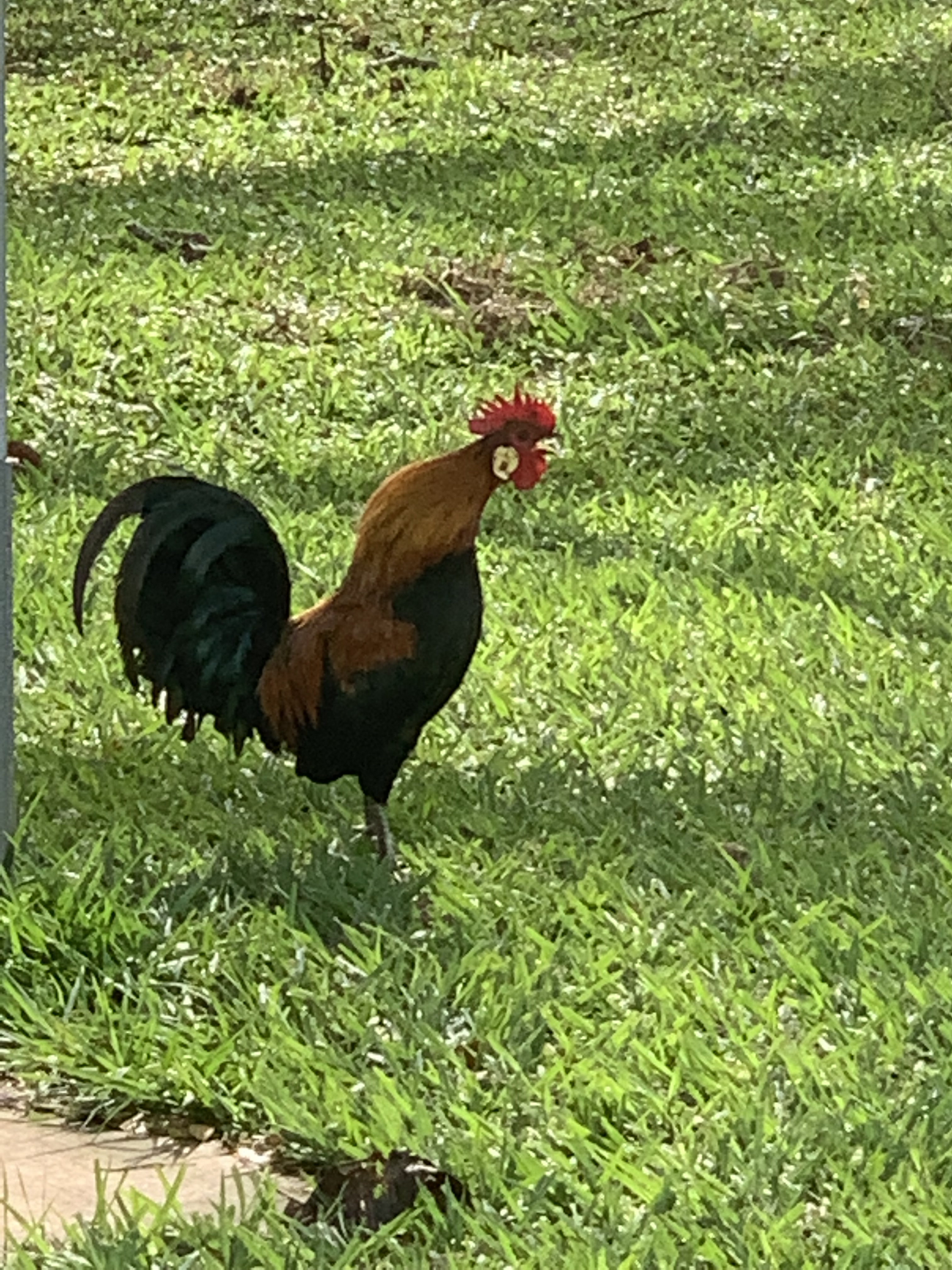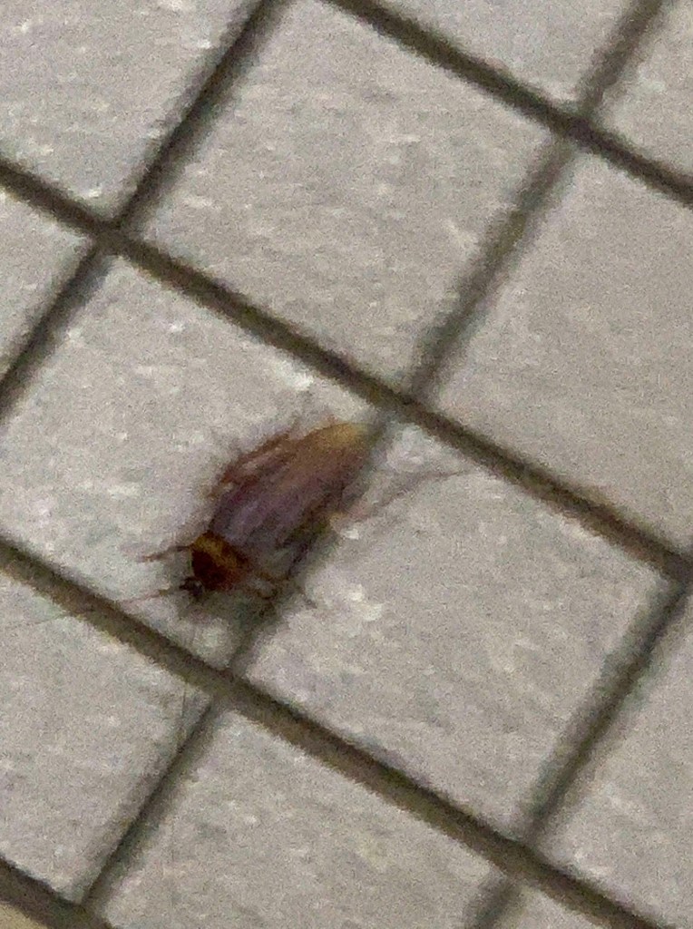 According to this article there are 19 cockroach species in Hawaii, but only 4 are considered significant pests. I’m guessing this one might fall into the category of “baby American cockroach” since I simply stepped over it going into and then coming back out of the ladies room. One could assess that it basically doesn’t fly, or even move much, for that matter. Although it could scare the crap out of us if it suddenly decides to take flight. Everyone entering or exiting the restroom just made sure not to step on it, which, causing a squishy mess when stepped on might be its greatest survival tactic. Who wants a fat splatted cockroach stuck to the bottom of your shoe?