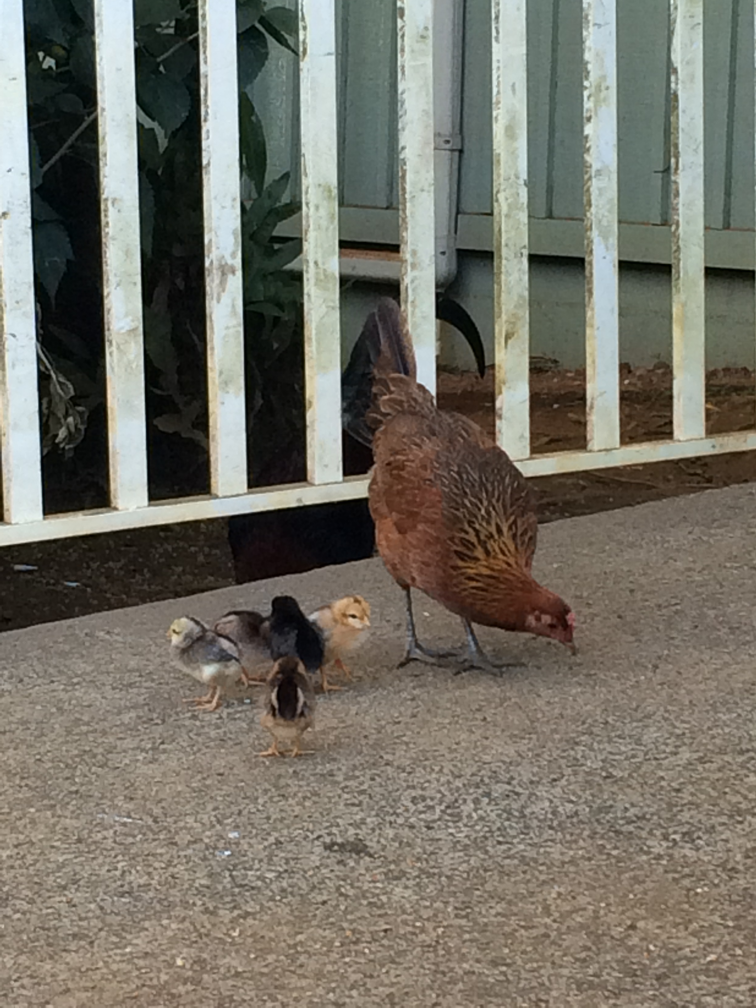 Headed back to our car now with groceries. Not even 20 feet from the front door, on the walkway to the store’s entrance, we see this hen