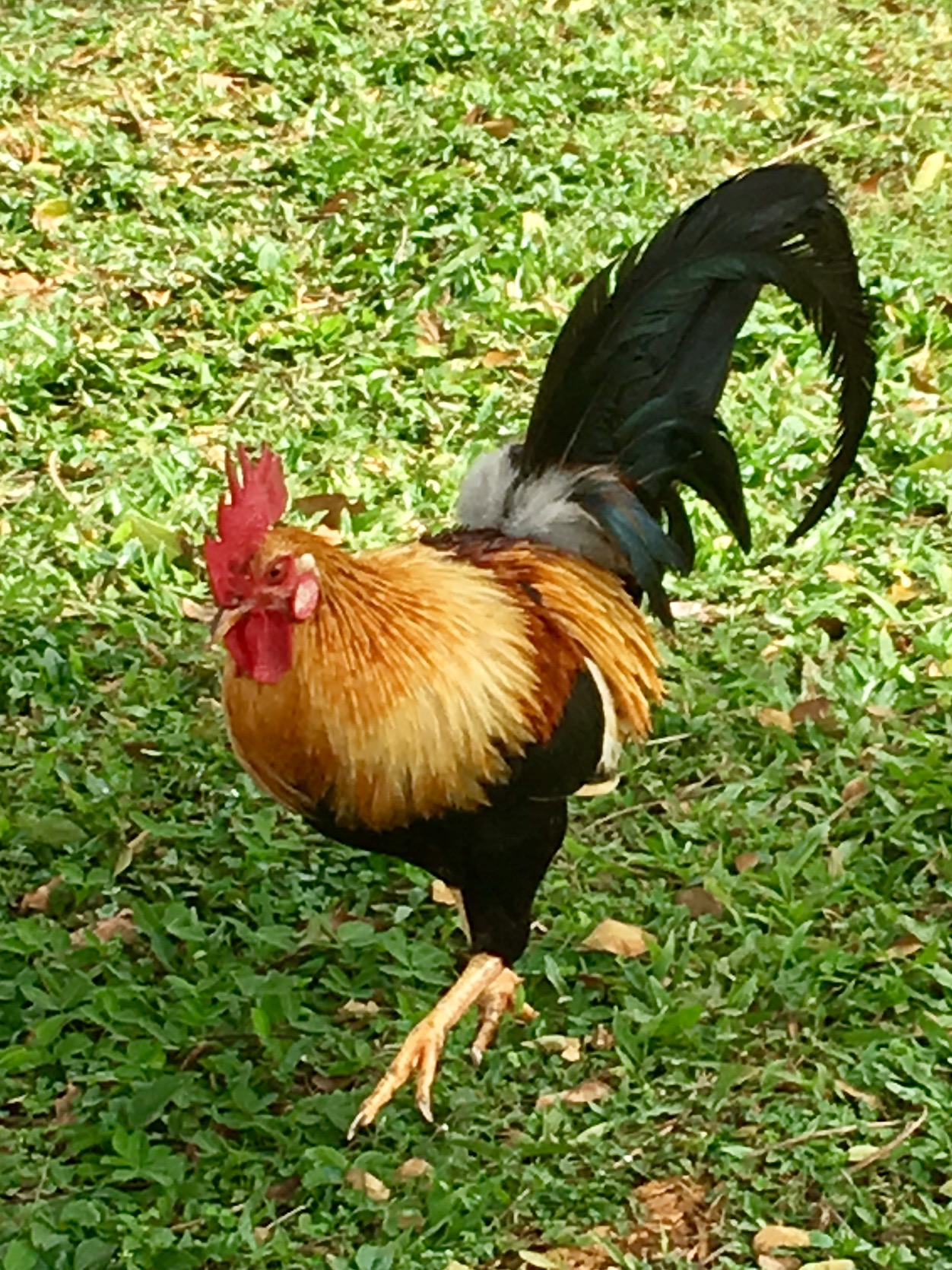 stalking us during lunch on an outdoor patio. A “Please do not feed the birds” sign is posted nearby, but how can we resist that face? Yeah, well, if you don’t resist, the rooster persists. Feral? You bet! Just try to catch that rascal.